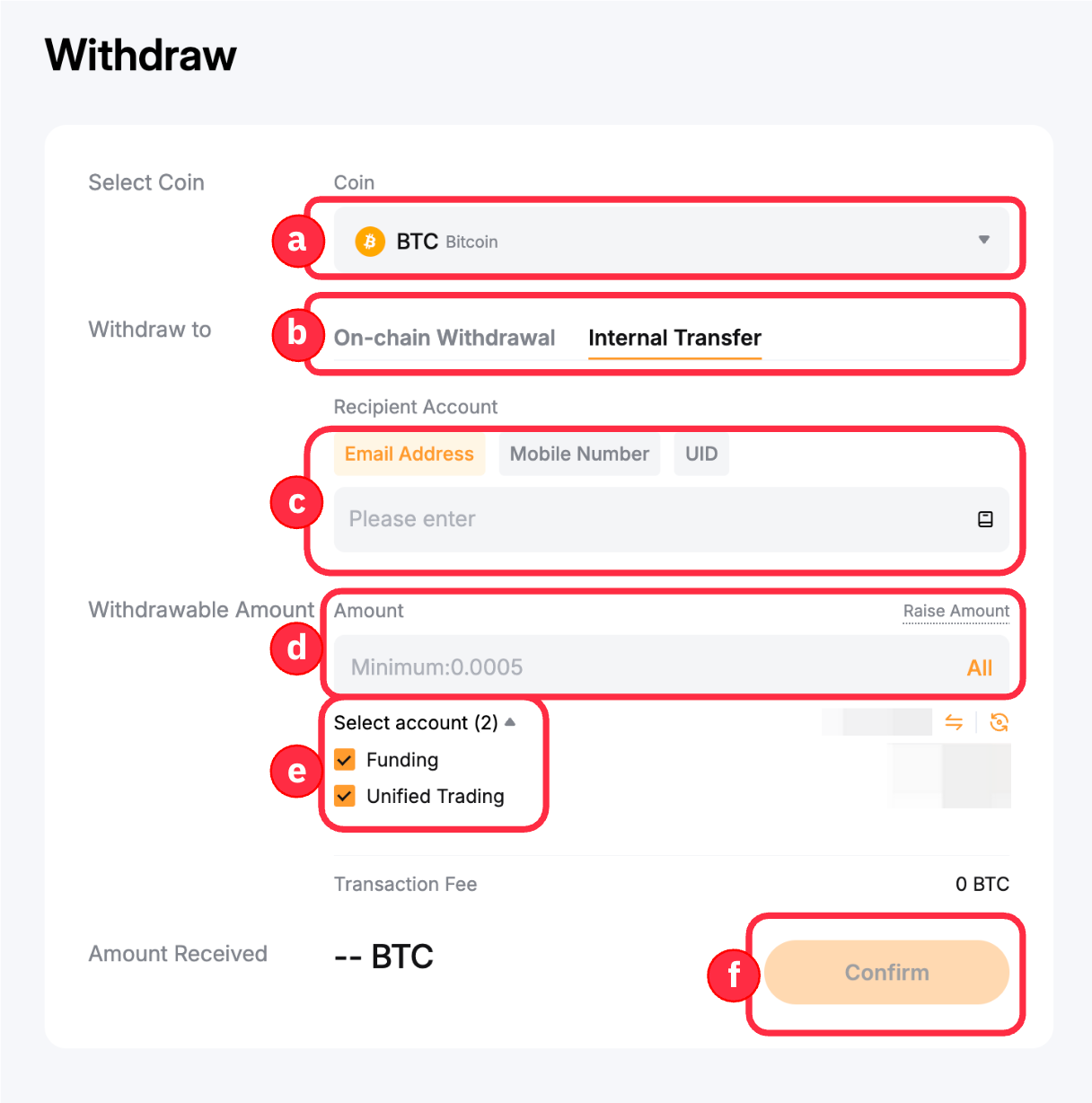e. Select Account: Tick the available boxes to choose from which account you would like to make a withdrawal. You can opt to withdraw from your Funding Account, Unified Trading Account, or both.