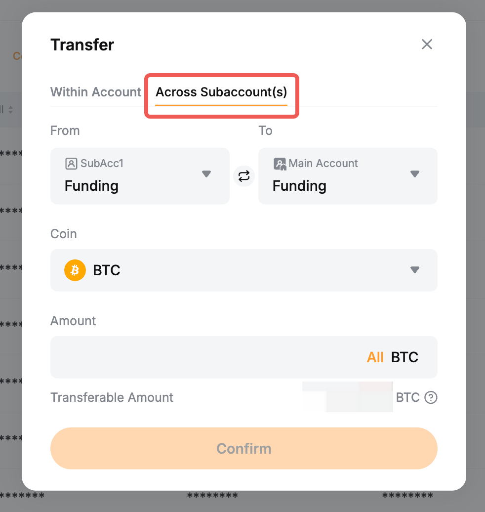 - If you want to withdraw assets located in your subaccounts, please transfer them to your main account by clicking on Transfer and select the Across Subaccount(s) tab.