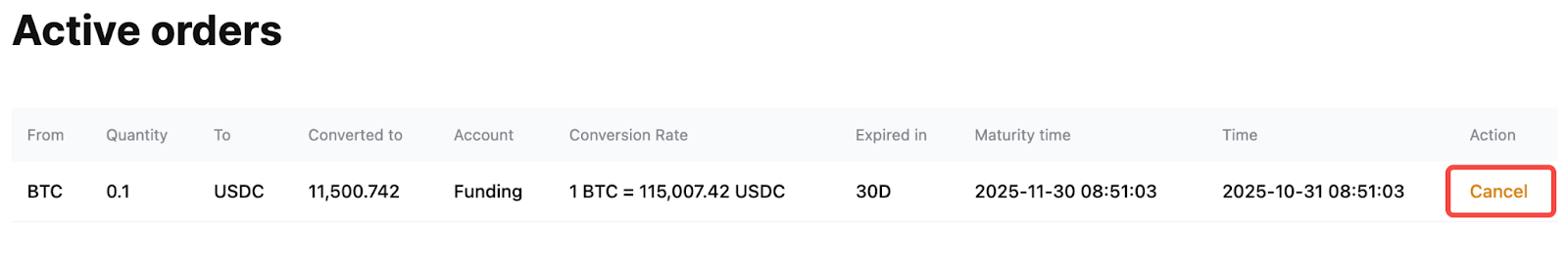 — Limit orders placed via Convert are valid for 30 days. The assets involved will be locked until the order is either filled or expires. If the order is not filled within 30 days, it will be automatically canceled.