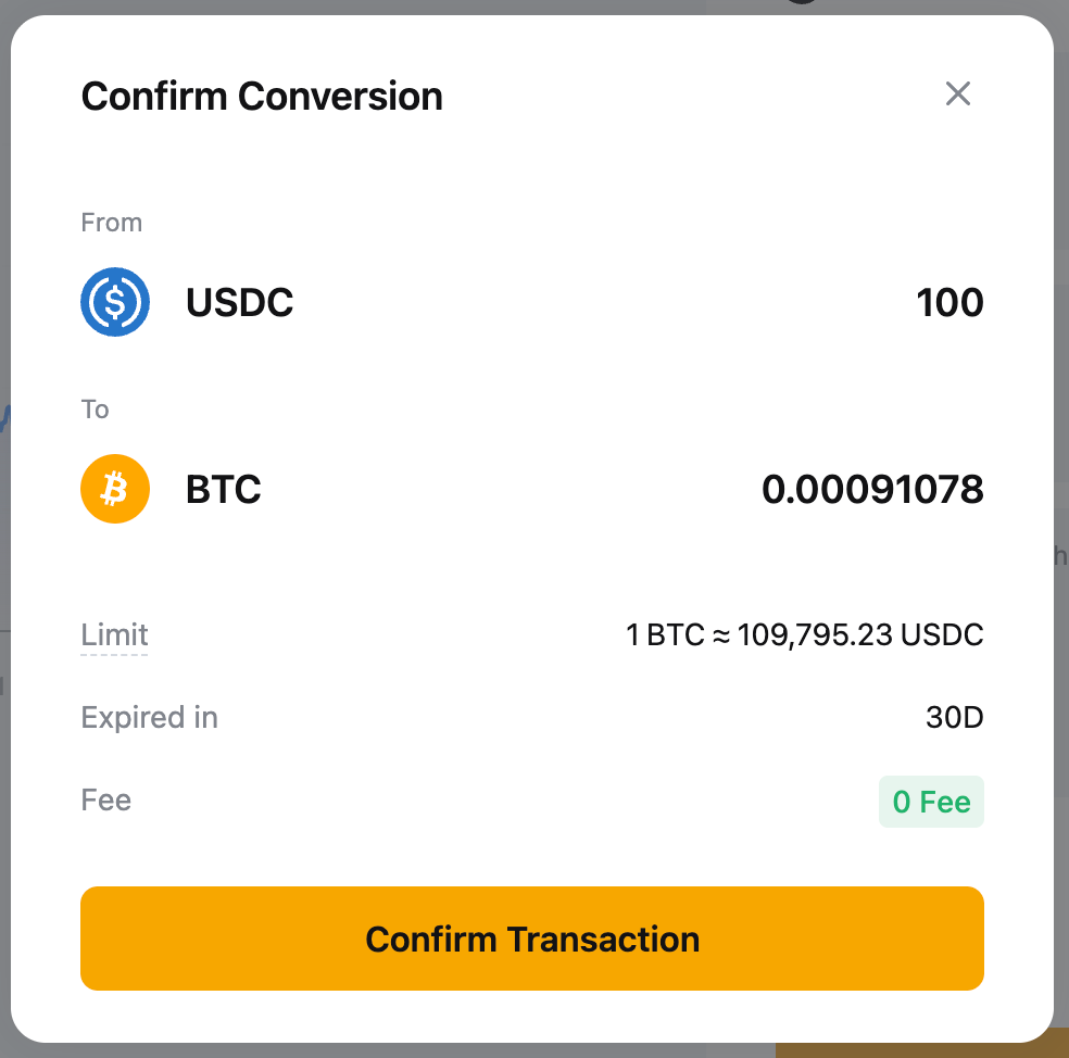 - Instant mode: Your assets will be converted immediately at the quoted price displayed on the page once you confirm the transaction.