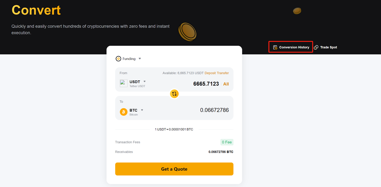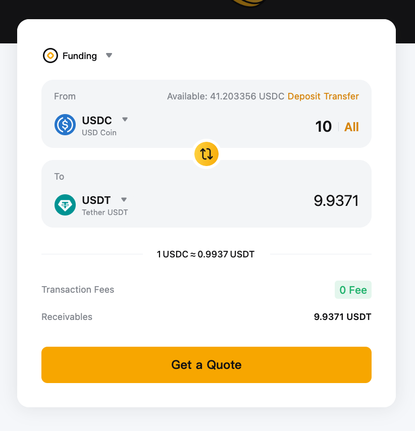 Instant mode: Your assets will be converted immediately at the quoted price displayed on the page once you confirm the transaction.