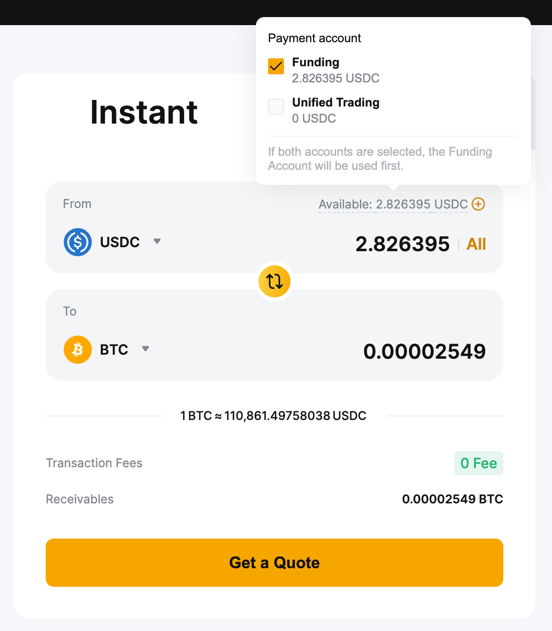 - Instant mode is supported on both the Funding Account and the Unified Trading Account, while Limit mode is only available via the Funding Account. Please ensure your funds are in the correct account before proceeding with the conversion.