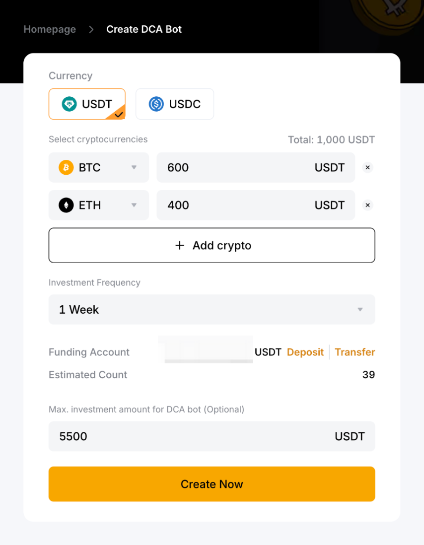 - Max. investment amount for DCA bot (Optional): 5,500 USDT