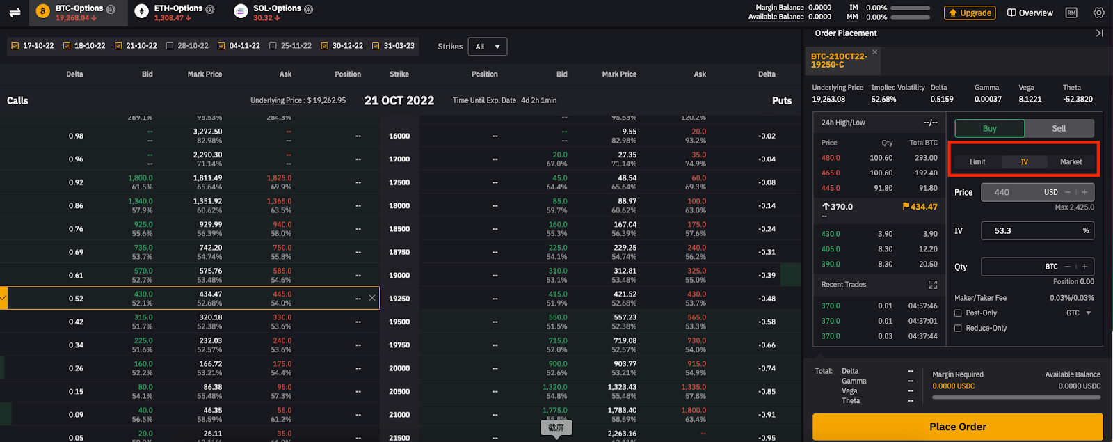 Please note that placing an order based on IV — that is, your order price — will change with the price of the underlying asset and the expiration time of the Option.
