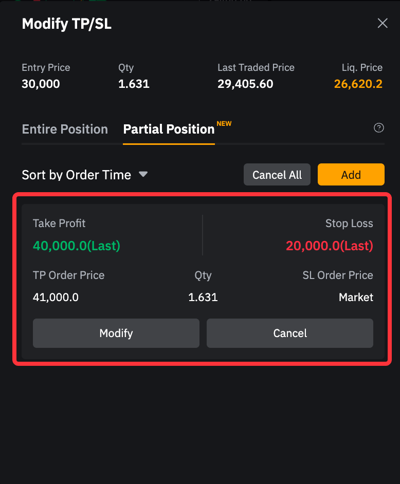 Users can set the TP/SL for Entire Position or Partial Position freely. |