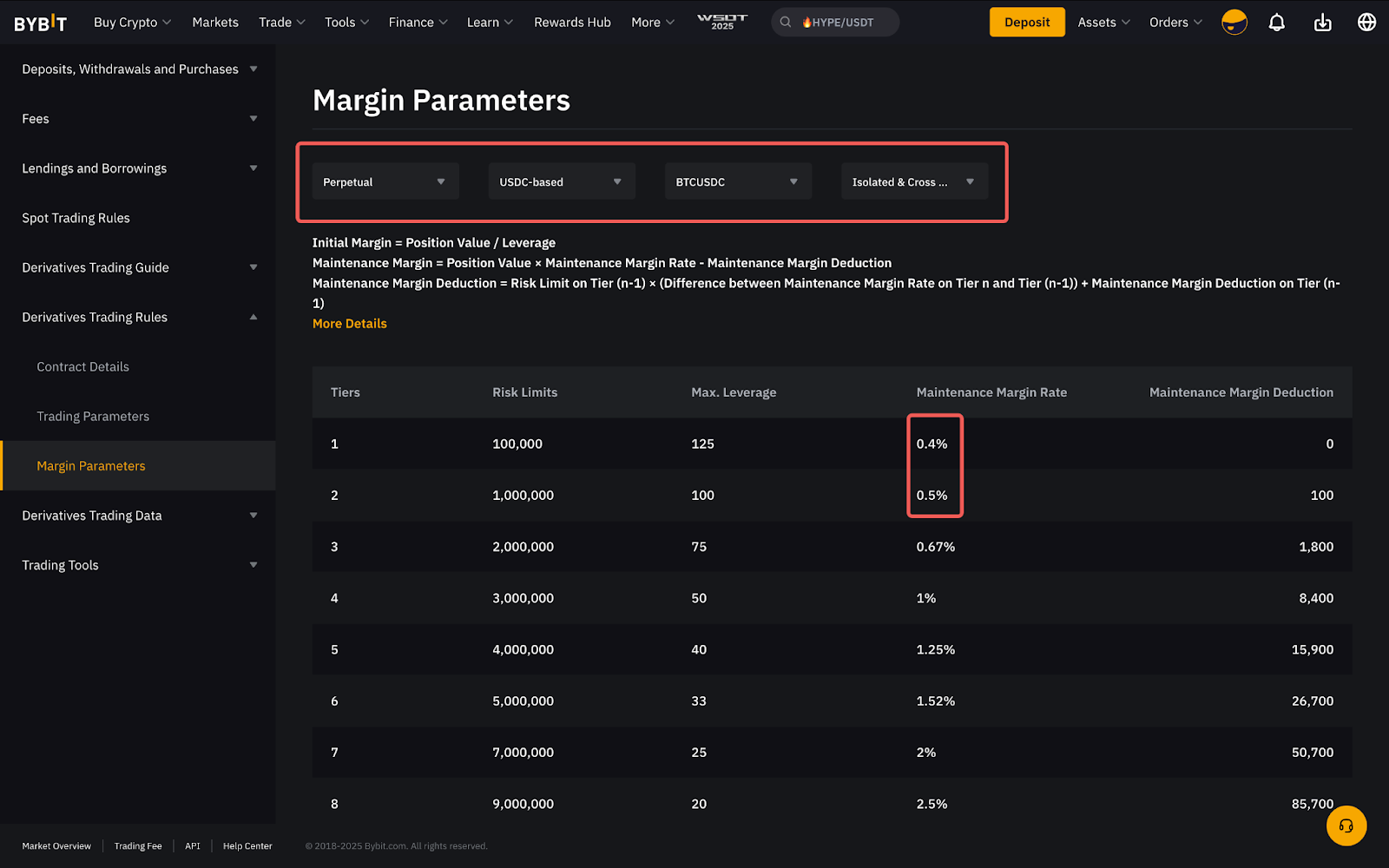 The MMR required for each risk limit tier and the Maintenance Margin Deduction amount can be easily found on the Margin Parameters page.
