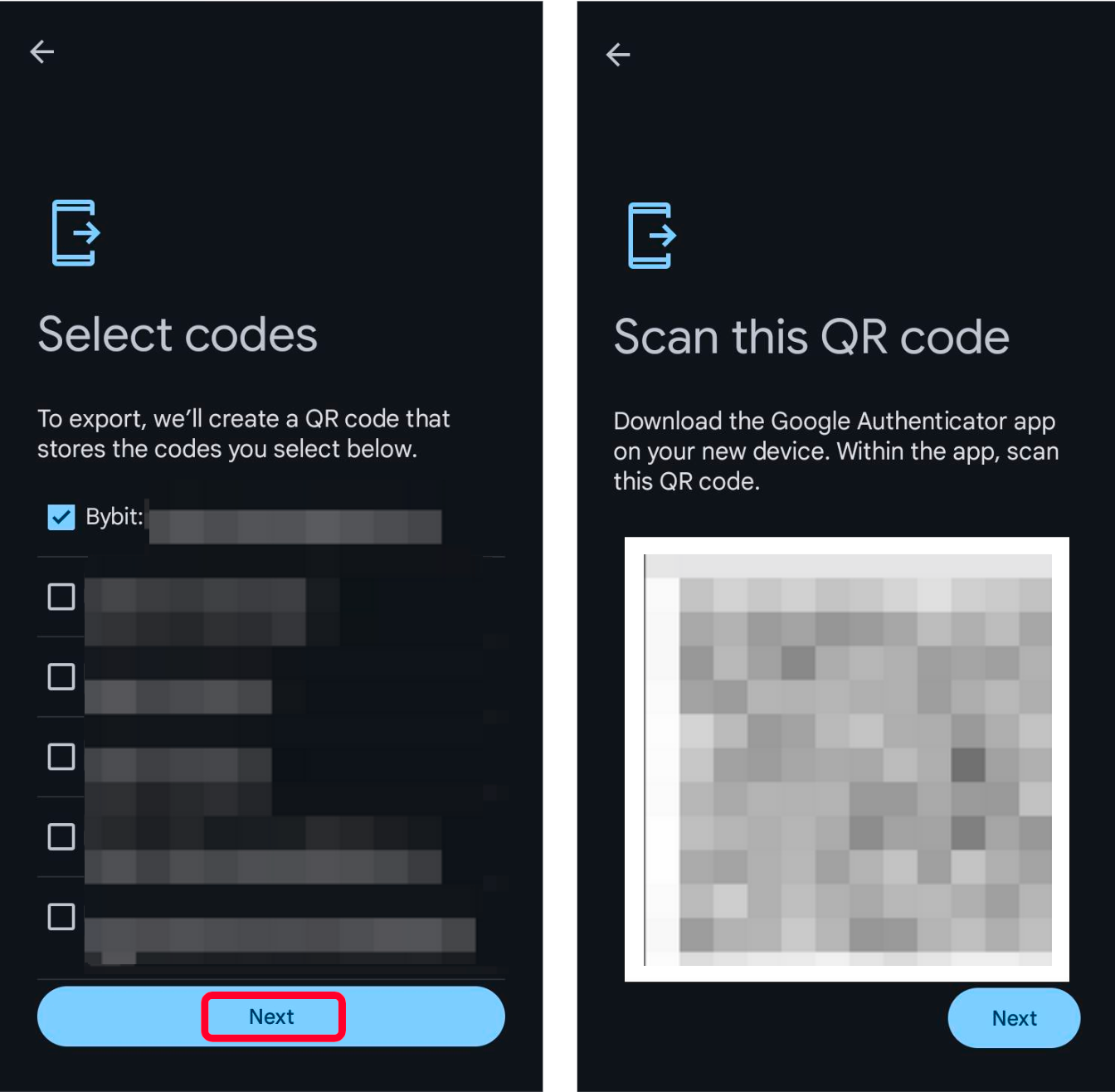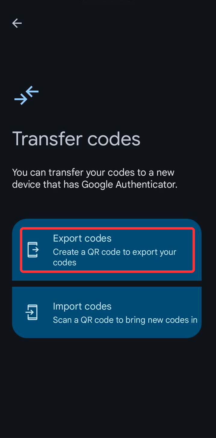 Tap on the Export codes option, then select an account to bring the code onto a new device via a QR scan.