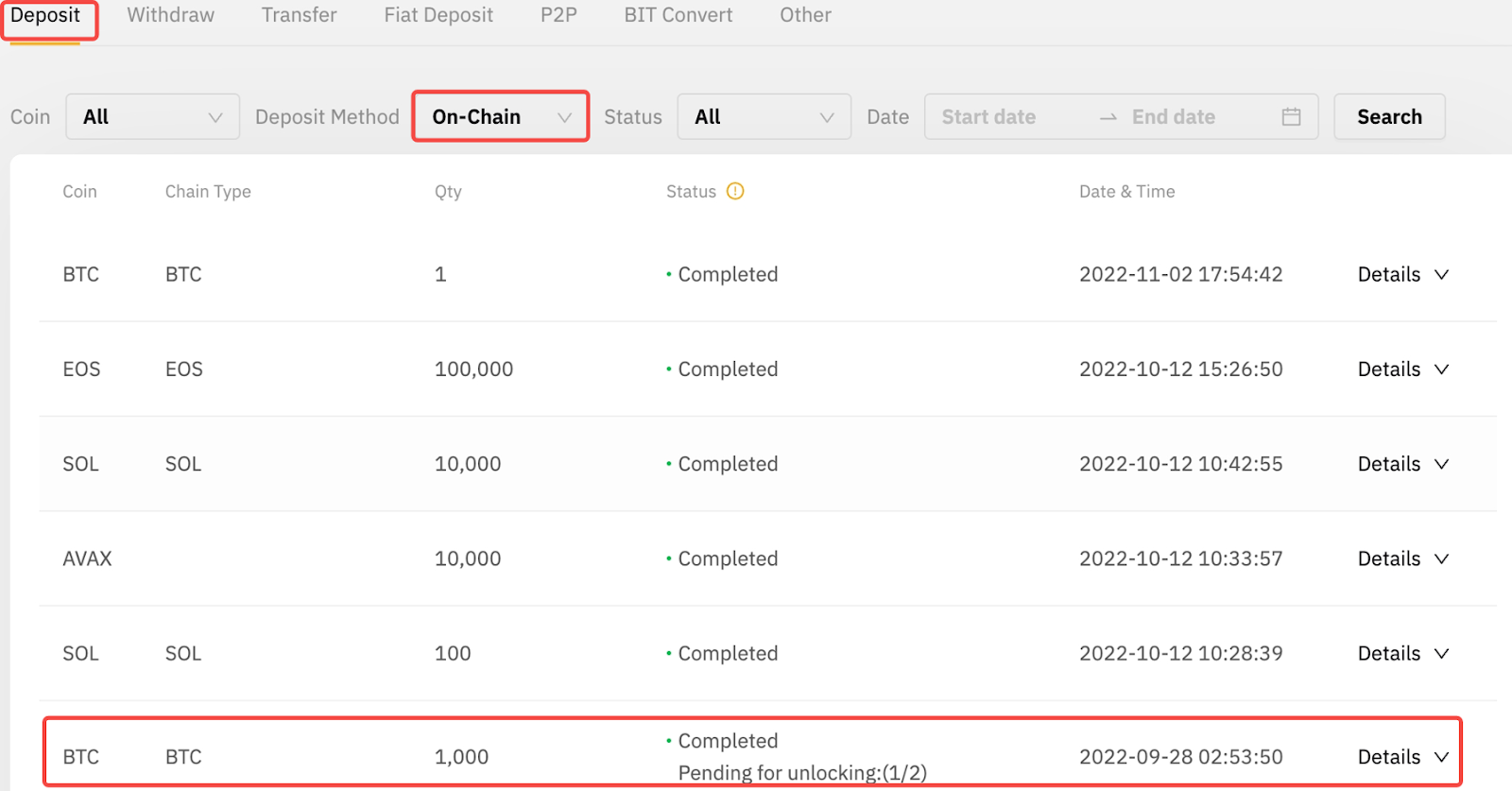 Құлыпталған активтерді және шығаруды ашуға қажетті растаулар санын тексеру үшін Қаржыландыру шоты тарихы → Депозит арқылы көре аласыз.