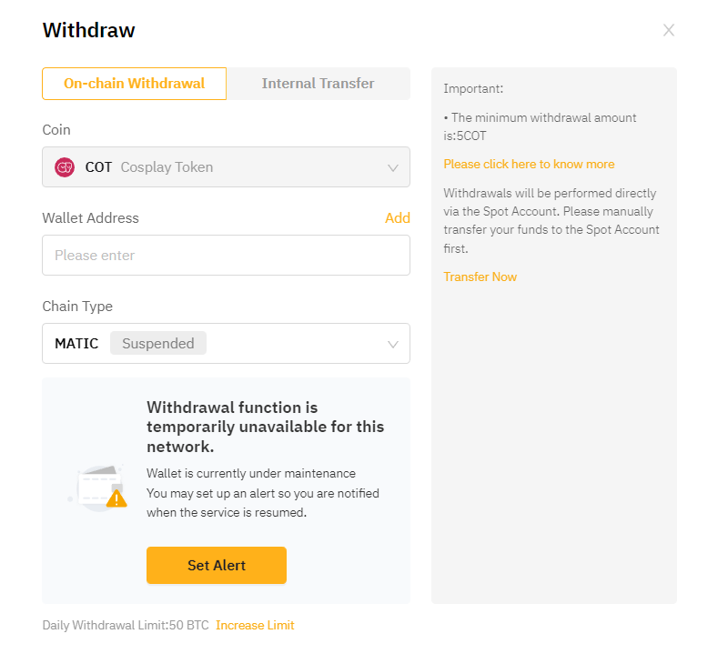 Мұндай жағдай сирек кездеседі, бірақ кейде Bybit Kazakhstan ішкі техникалық жұмыстарды жүргізу немесе блокчейнде жаңарту жұмыстары басталған кезде қаражат шығаруды уақытша тоқтатуы мүмкін. Бұл жағдайда қаражатты басқа блокчейн желілері арқылы шығаруға болады. Сонымен қатар, шығару мүмкіндігі қайта ашылғанда хабарлама алу үшін ескерту орнатуға және сәл кейінірек әрекетті қайталауға болады.
