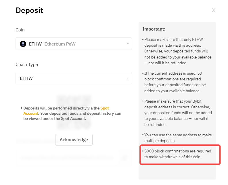 Әртүрлі блокчейндер үшін талап етілетін блок растаулары саны әртүрлі. Әр монета үшін талап етілетін блок растаулары санын белгілеу үшін депозит терезесін қарауыңызға болады.