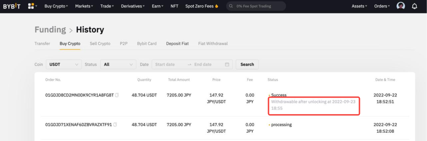 Сатып алынған активті шешіп алу үшін қашан құлпын ашуға болатынын тексеру үшін Қаржыландыру шоты → Тарих → Крипто сатып алу бөліміне барыңыз.