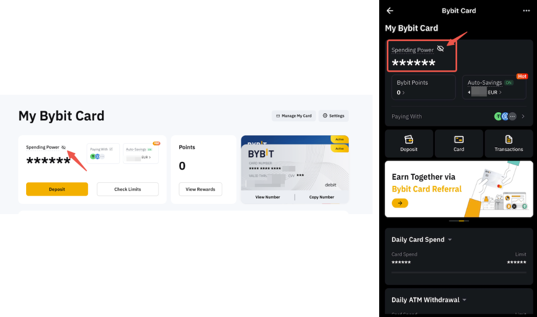 Bybit картасының бақылау тақтасындағы Жұмсау мүмкіндігінің жанында орналасқан көз белгішесін қосыңыз.