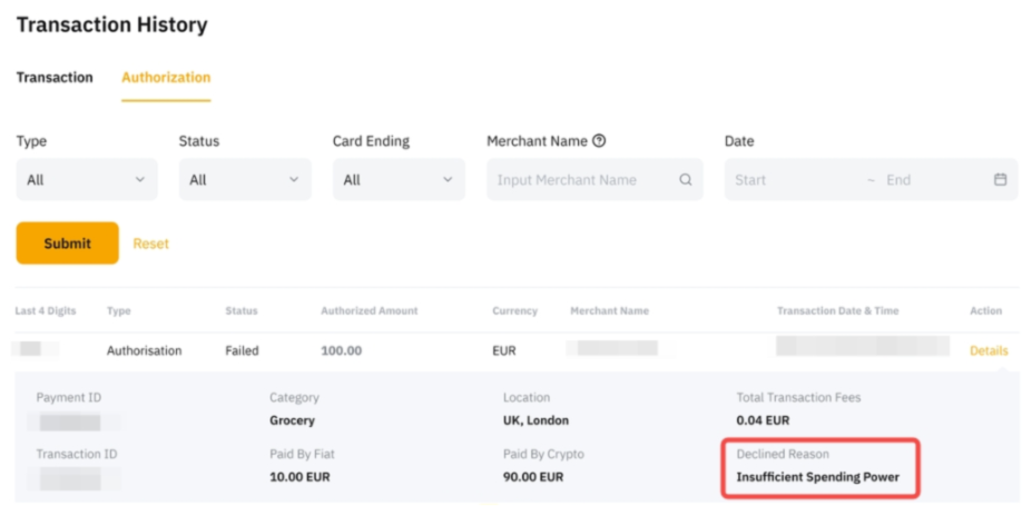 Бас тартылған себепті тексеру үшін Bybit картасының Транзакциялар тарихы → Авторизация → тиісті транзакцияның Мәлімет бөліміне өтіңіз.