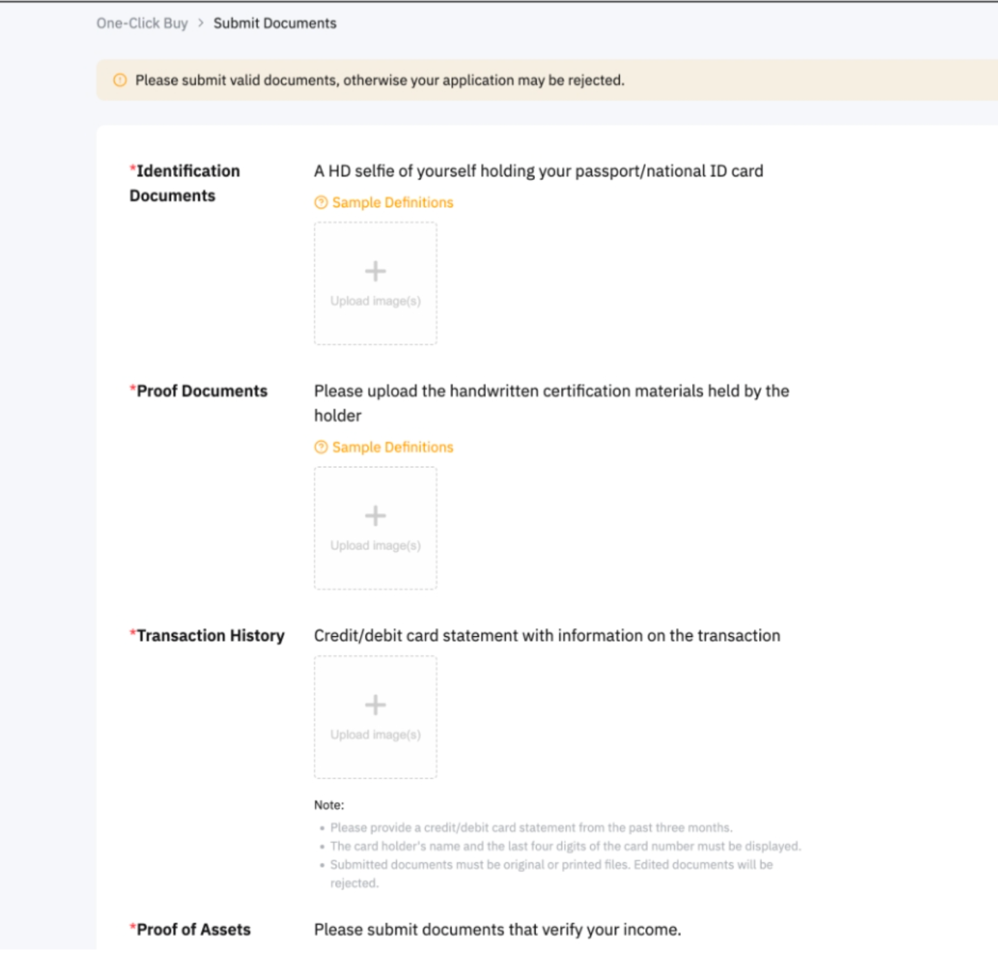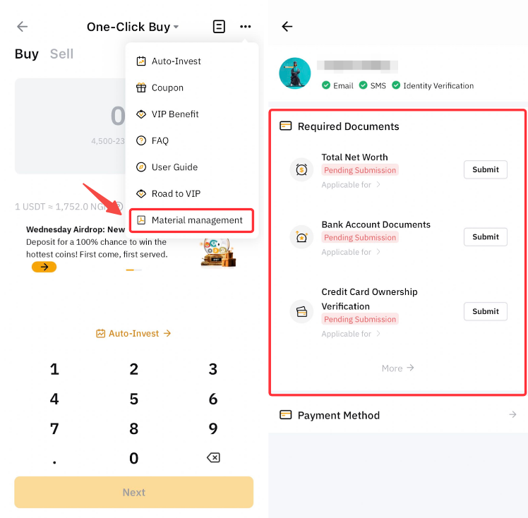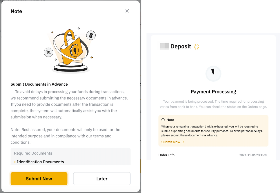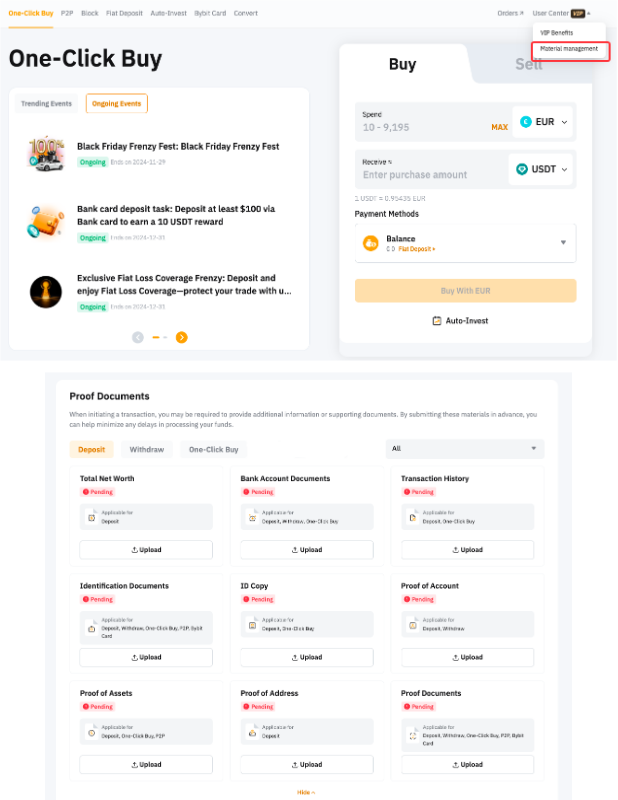 Біз сізге қажетті құжаттарды алдын ала тапсыру үшін жинау пунктін жасадық. Бұл функция қызмет провайдерлері немесе банктік процедуралар сияқты үшінші тарап талаптарына байланысты ақша аударымдарындағы кідірістерді немесе транзакция процесіне басқа әсерлерді болдырмауға көмектеседі. сайтына өту арқылы тиісті құжаттарды ұсыну порталы арқылы алдын ала тапсыруды ұсынамыз Бір рет басу арқылы сатып алу немесе Fiat депозиті бет → Пайдаланушы орталығы → Материалдарды басқару.