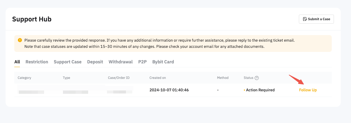 Хабарлама алсаңызe қосымша ақпарат сұрасаңыз немесе Тәуекел туралы ескерту қалқымалы хабарына тап болсаңыз, түймесін басыңыз Жіберу. Сіз сұралған құжаттарды жіберуге болатын бетке қайта бағытталасыз. Сонымен қатар, жіберу билеттерін мына жерден таба аласыз Қолдау хабы.
