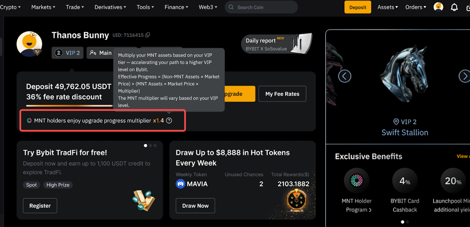 Қолданбаны пайдаланып жатсаңыз, жоғарғы сол жақ бұрыштағы профиль суретін түртіңіз, одан кейін MNT көбейткіш күйін көру үшін VIP деңгейіңізді түртіңіз.