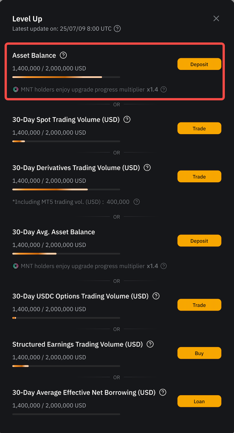 Бұл сіз тұрған VIP трекке байланысты — ағымдағы баланс немесе 30 күндік орташа баланс. MNT мультипликаторы VIP талаптарын есептеу әдісін өзгертпейді; ол сізге тезірек ілгерілеуге көмектесу үшін тек сіздің MNT холдингіңізге қолданылады. VIP талаптары туралы толық ақпаратты мына жерден қараңыз VIP критерийлері және алымдар құрылымы бөлімі VIP бағдарламасының беті. Деректер күнделікті айналада жаңартылады таңғы 8 UTC, бірақ кейде кешігулер болуы мүмкін.