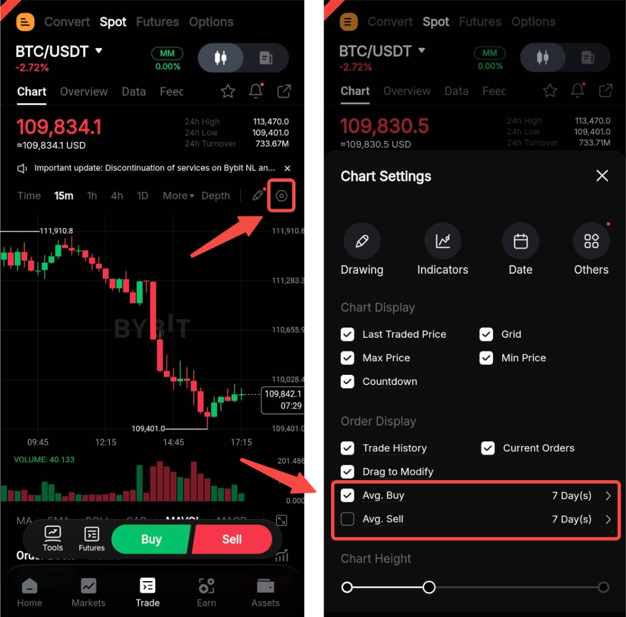 Спот саудада орташа сатып алу және сату бағасын сауда диаграммасында бірден көрсетуге болады. Ол үшін «Көрсету» түймесін басып, орташа бағаны көрсету опциясын таңдаңыз. Сондай-ақ, есептелетін кезеңді таңдауға болады. Ескерту: есептеу ағымдағы күннен бастап таңдалған кезеңнің соңғы күніне дейінгі сауда деректеріне негізделеді.