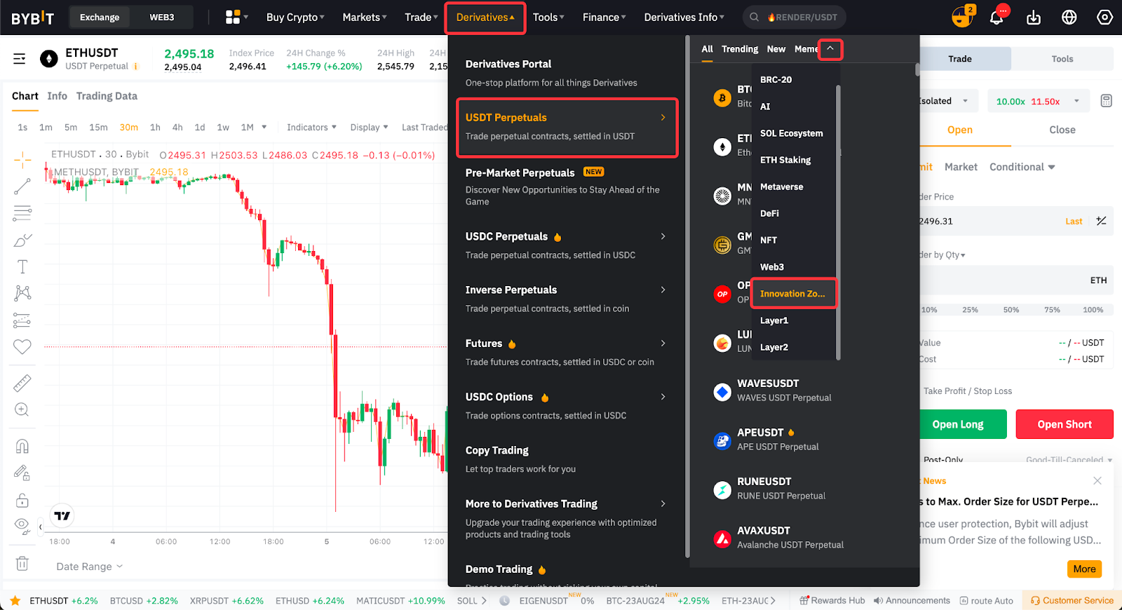 «Инновациялық аймаққа» және оның келісімшарттарына қатынасу үшін Деривативтер USDT мерзімсіз келісімшарттары, ашылмалы мәзірде Инновация аймағы дегенді таңдаңыз.