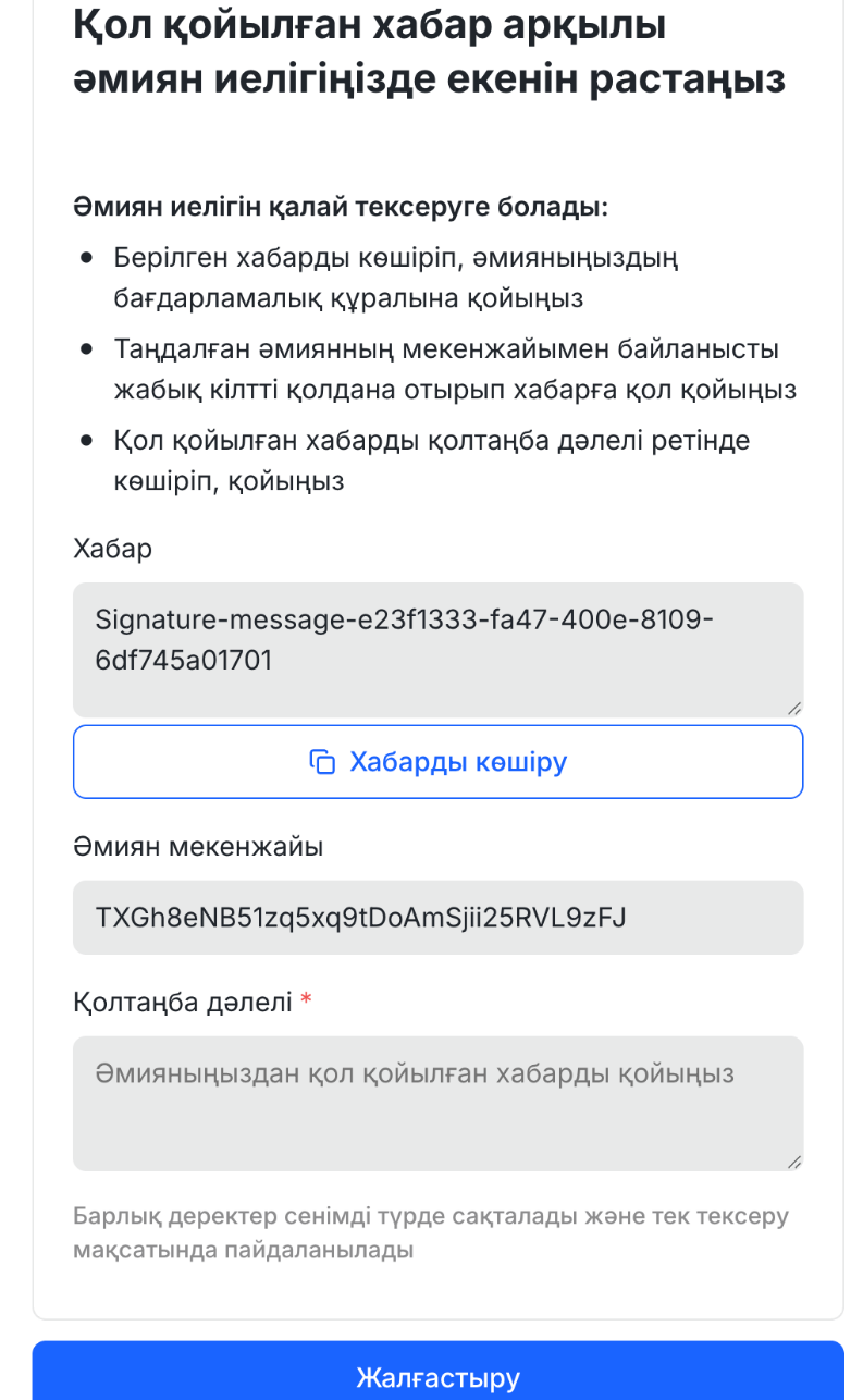 Сізге әмиянға иелік ететініңізді растау және декларация формасын толтыру қажет. Бұл үшін Аккаунттың шығару тарихы бетінде қолжетімді верификация сілтемесіне өту керек.