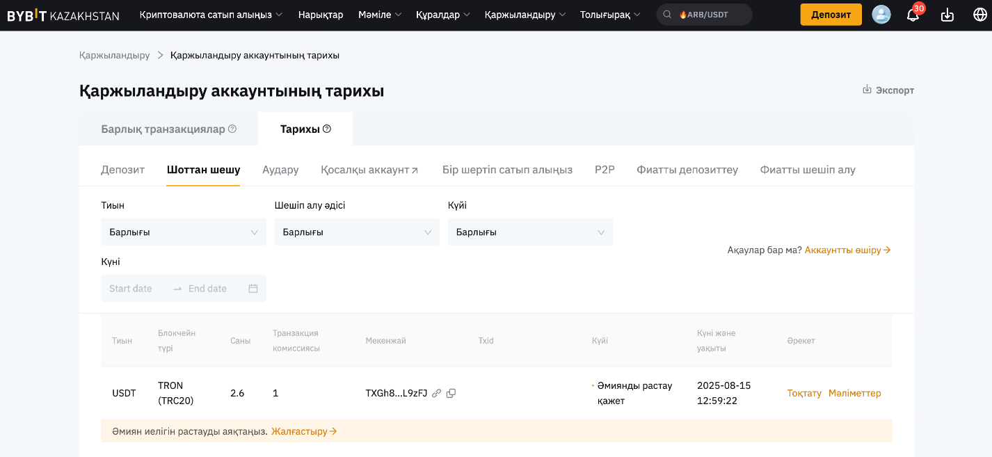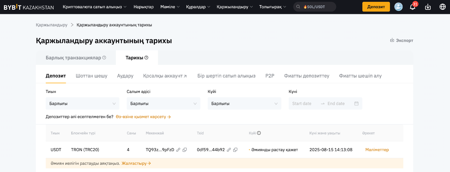 Криптоактивтерді енгізу немесе шығару кезінде қосымша әрекеттер талап етіле ме, соны тексеру үшін "Депозиттік аккаунт тарихы" немесе "Шығару тарихы" бөлімдеріне өтіңіз.