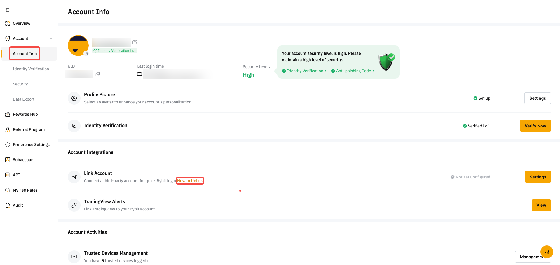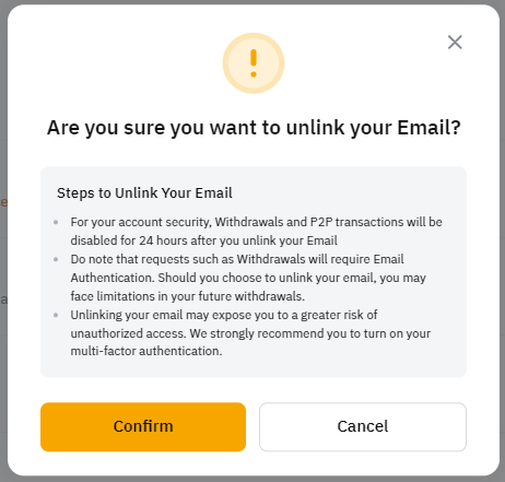 Электрондық пошта мекенжайын тіркелгіңізге байланыстыру өте ұсынылады, себебі бұл тіркелгіңіздің қауіпсіздігін арттырады. Бұл қаражатты алу немесе қауіпсіздік параметрлері мен API интерфейстерін басқару сияқты әрекеттер үшін қажет. Сондықтан, егер сіз электрондық поштаңыздың байланысын жоюды шешсеңіз, болашақта ақшаны алу үшін шектеулерге тап болуыңыз және тіркелгіңізге рұқсатсыз кіру қаупі жоғары болуы мүмкін екенін ескеріңіз.