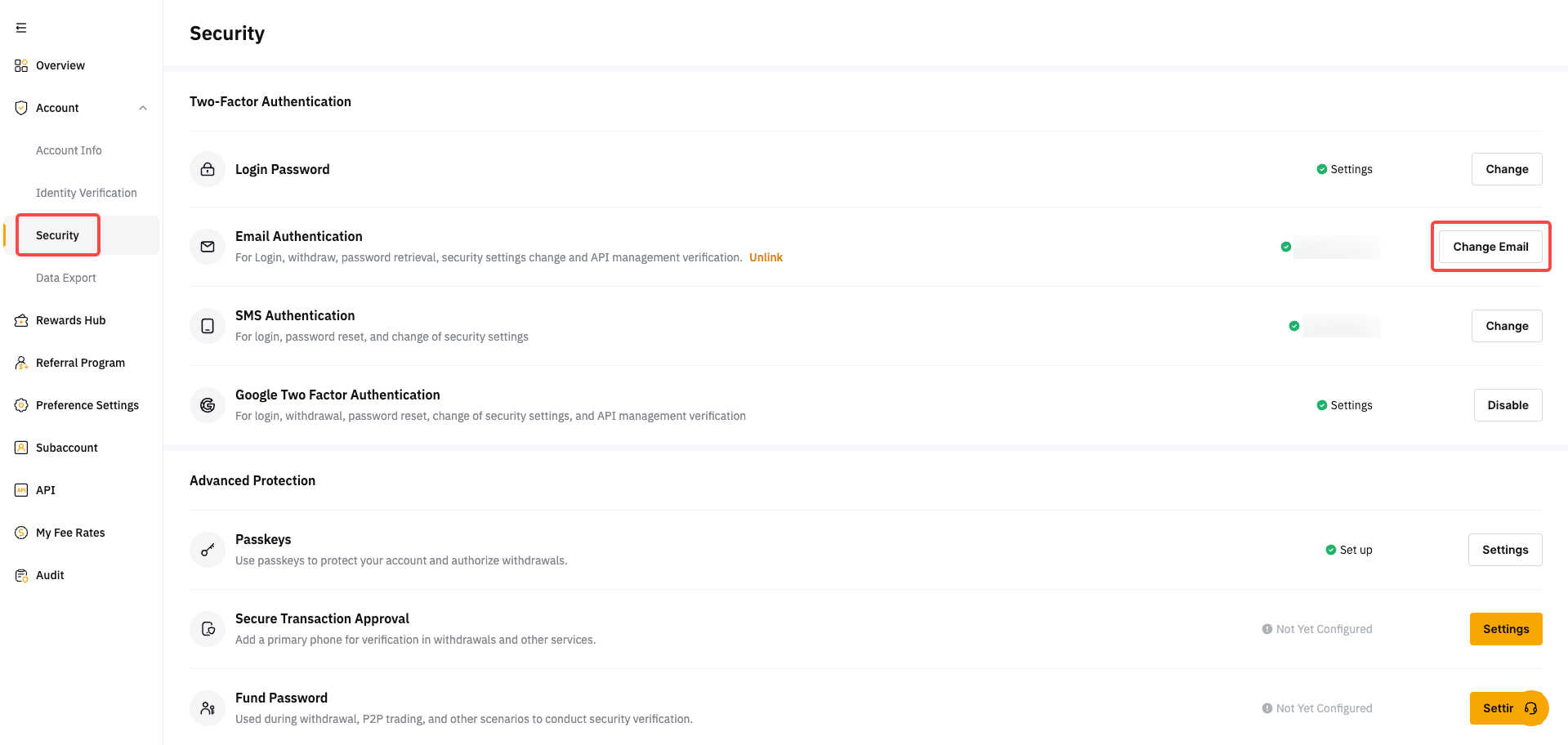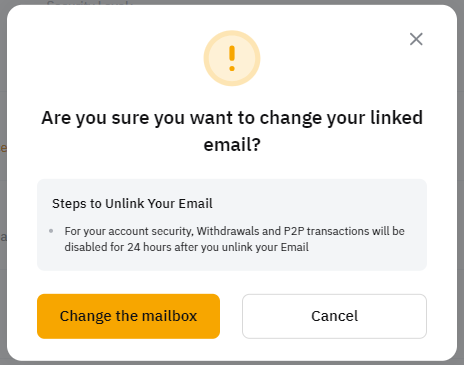 Есептік жазбаңыздың қауіпсіздігі үшін ақшаны алу және P2P транзакциялары болады 24 сағатқа мүгедек электрондық поштаңызды өзгерткеннен кейін. Сондай-ақ, өзгерту аяқталғаннан кейін келесі жеті (7) күн ішінде электрондық поштаңызды өзгерту немесе ажырату мүмкін болмайтынын ескеріңіз.