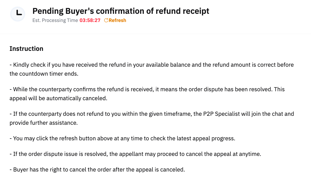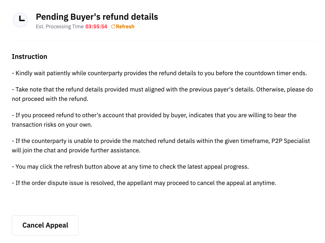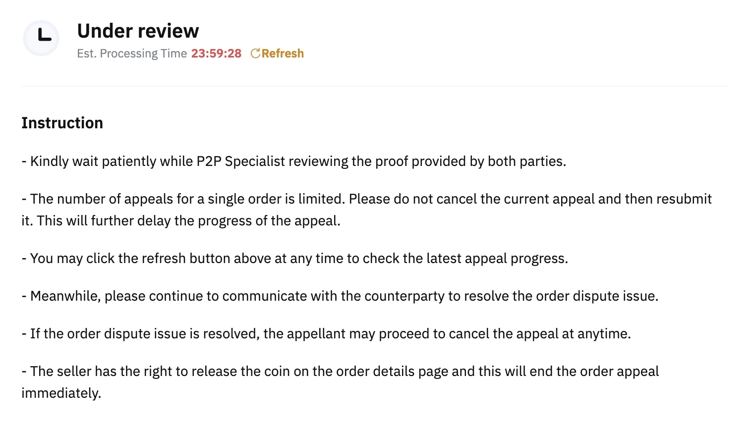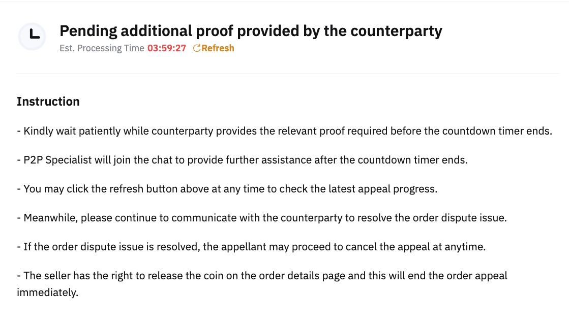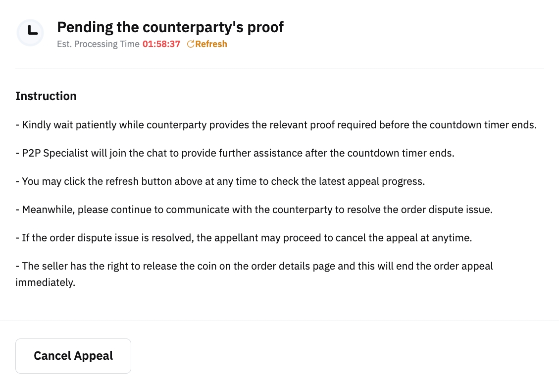 Сіздің апелляцияңыз әрі қарай өңдеу кезеңіне әлі жеткен жоқ. Кері санақ таймері аяқталғаннан кейін P2P маманы чатқа қайта қосылады. Жаңартуларды шыдамдылықпен күтіңіз және P2P маманы берген нұсқауларды орындаңыз.