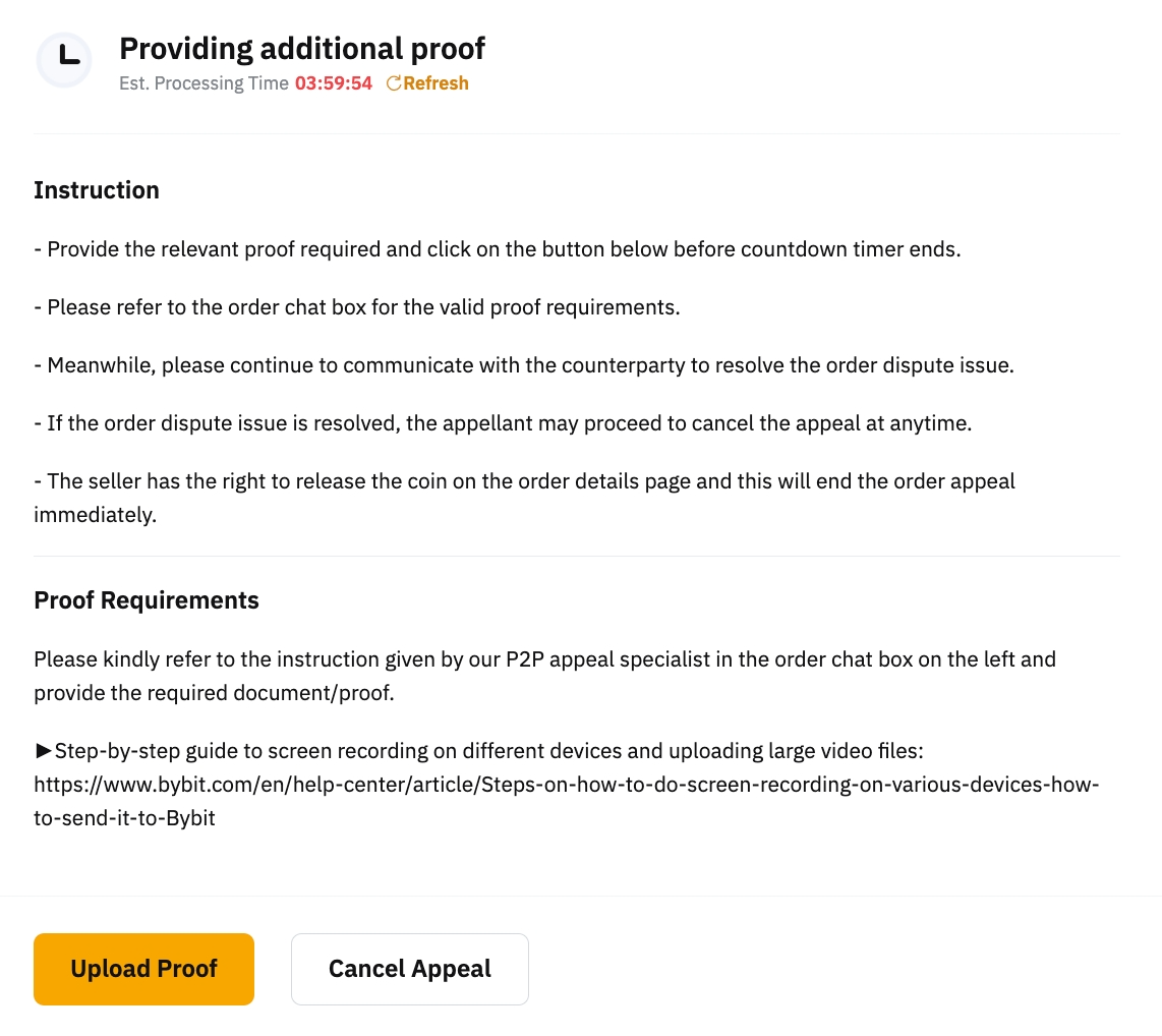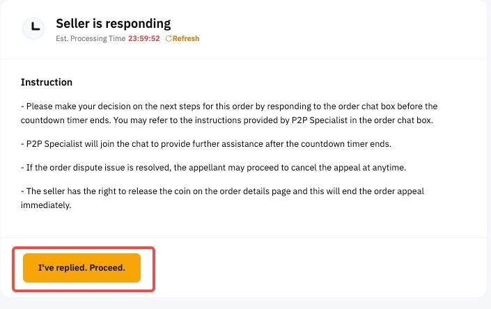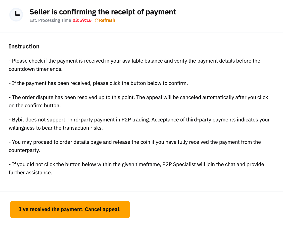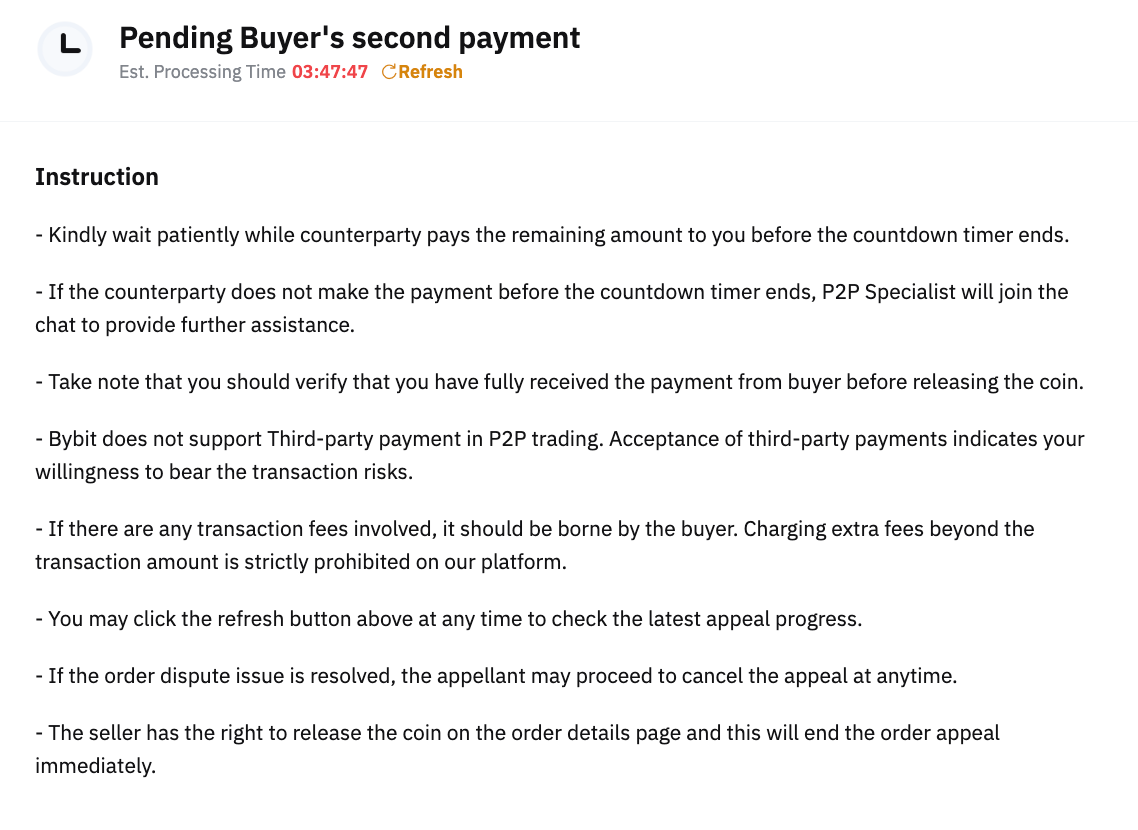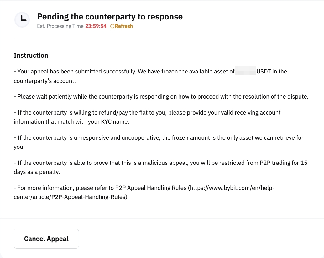 Сіздің апелляцияңыз әрі қарай өңдеу кезеңіне әлі жеткен жоқ. Кері санақ таймері аяқталғаннан кейін P2P маманы чатқа қайта қосылады. Жаңартуларды шыдамдылықпен күтіңіз және P2P маманы берген нұсқауларды орындаңыз.