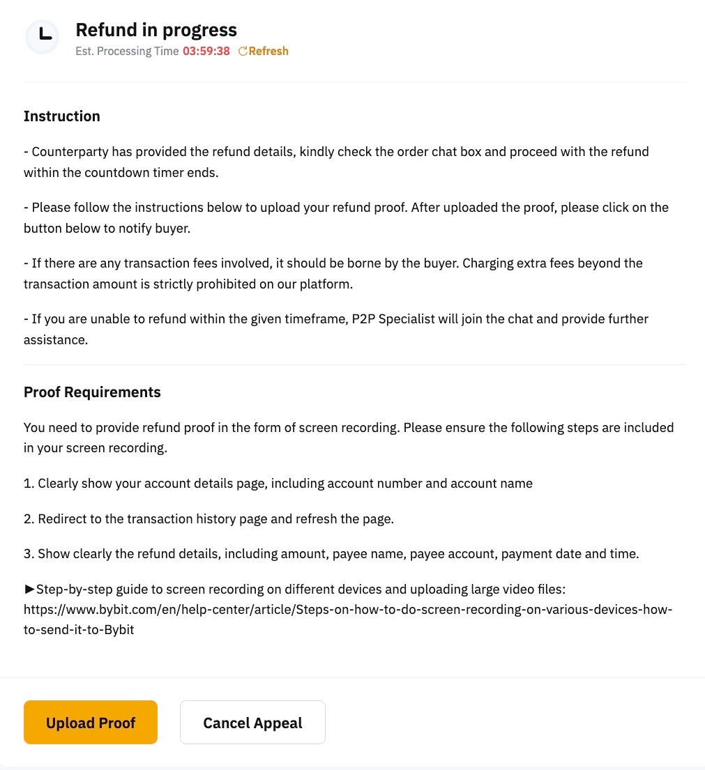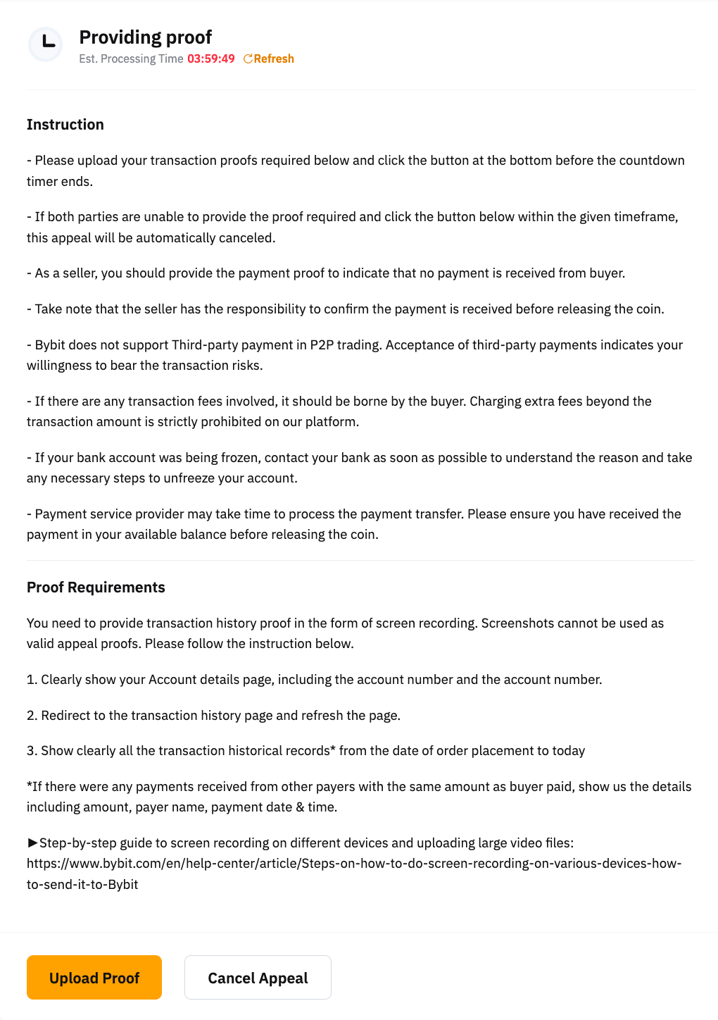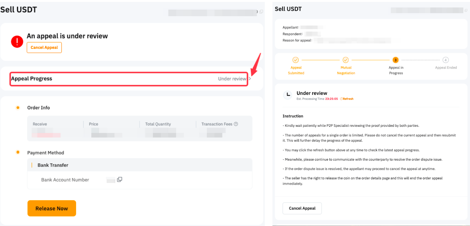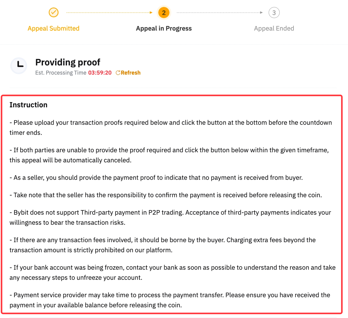 Сіздің апелляцияңыз әрі қарай өңдеу кезеңіне әлі жеткен жоқ. Кері санақ таймері аяқталғаннан кейін P2P маманы чатқа қайта қосылады. Жаңартуларды шыдамдылықпен күтіңіз және P2P маманы берген нұсқауларды орындаңыз.