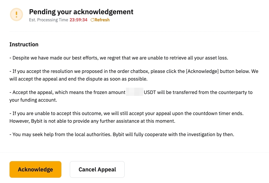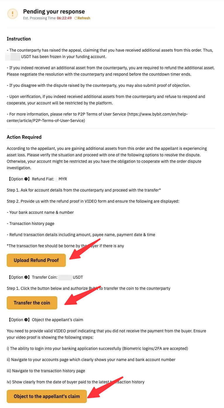 Қарсы тарап P2P маманы берген шешімді мойындағанша шыдамдылықпен күтіңіз. Қосымша активті алсаңыз, есептік жазбаны шектеуді болдырмау үшін берілген мерзімде қайтаруды жалғастырыңыз. Шұғыл жауап беру және апелляцияны сәйкесінше шешу үшін тапсырыс чат өрісін тексеріп, жағдайды тексеріңіз.