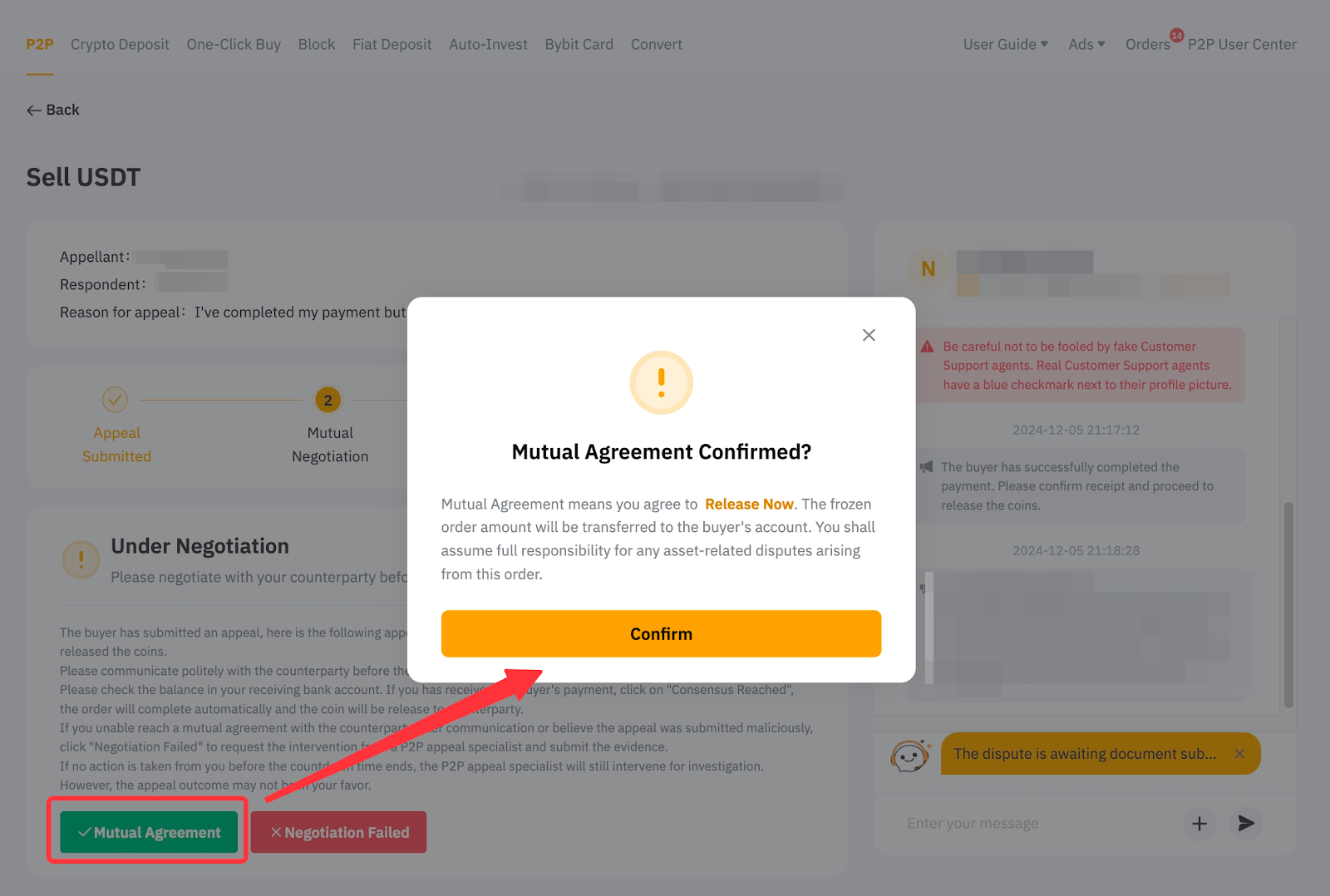 Сізден P2P маманы тапсырыс чат жолағында ұсынған ажыратымдылықты тексеру қажет. түймесін басыңыз Мойындау берілген ажыратымдылықты растасаңыз, түймесін басыңыз.
