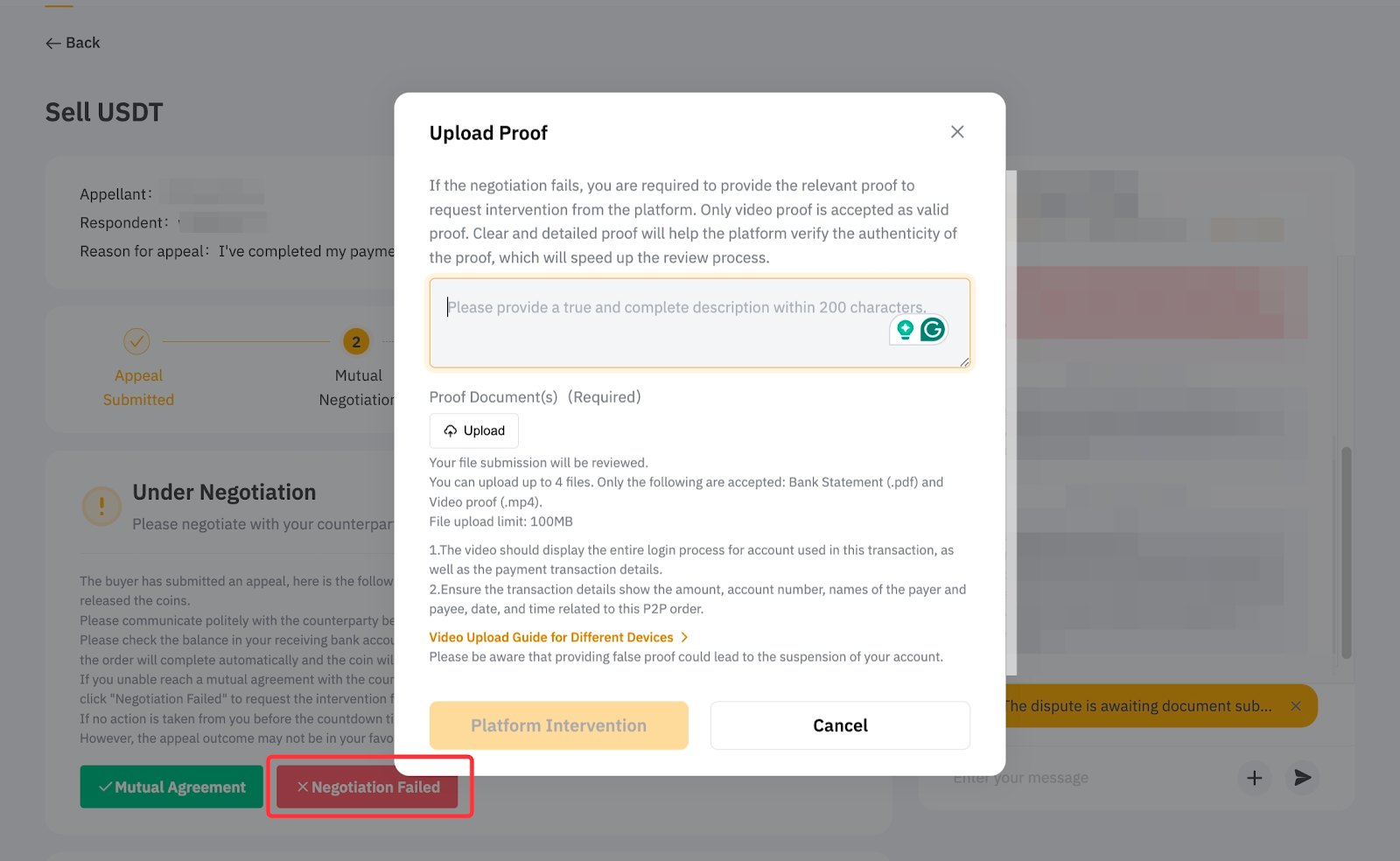 Егер контрагентпен байланысқаннан кейін уақыт бітсе немесе мәселеңіз шешілмесе, түймесін басыңыз Келіссөздер сәтсіз аяқталды және платформаға араласуды сұрау үшін дәлелдемелерді жіберіңіз. Егер контрагент кері санақ уақыты аяқталғанға дейін әрекет етпесе, платформа кері санақ уақыты аяқталғаннан кейін тергеуге араласады.