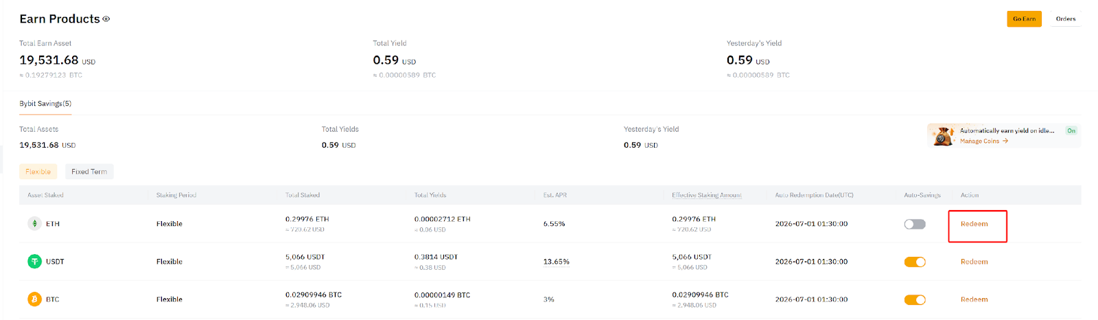 1-қадам: Активтер → Табыс бөліміне өтіп, Табыс алу өнімдер бетіне кіріңіз. Өтеуді қажет ететін Икемді мерзім жоспарын таңдап, ордер мәліметтерін қарап шығып, Өтеу түймесін басыңыз.