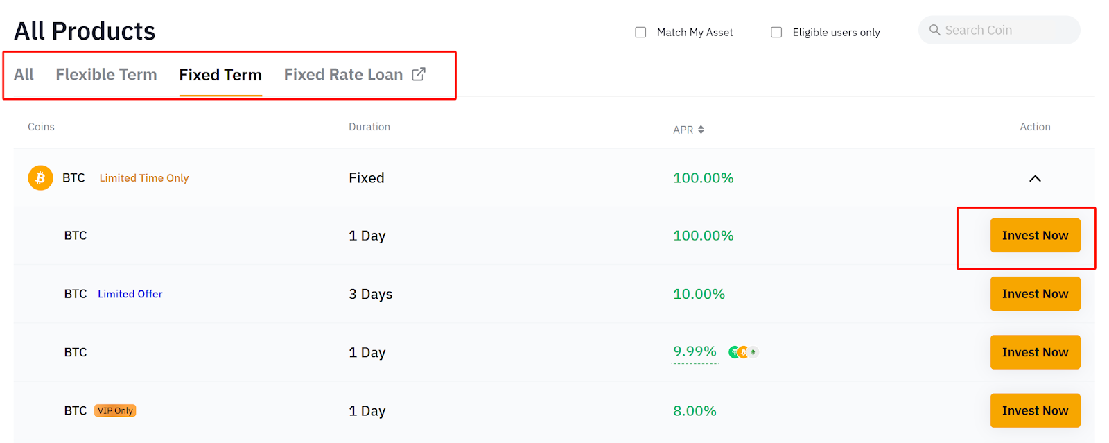 2-қадам: Тиынға, мерзімге және APR негізінде қалаған Easy Earn жоспарын таңдаңыз, содан кейін Қазір инвестициялау түймесін басыңыз.