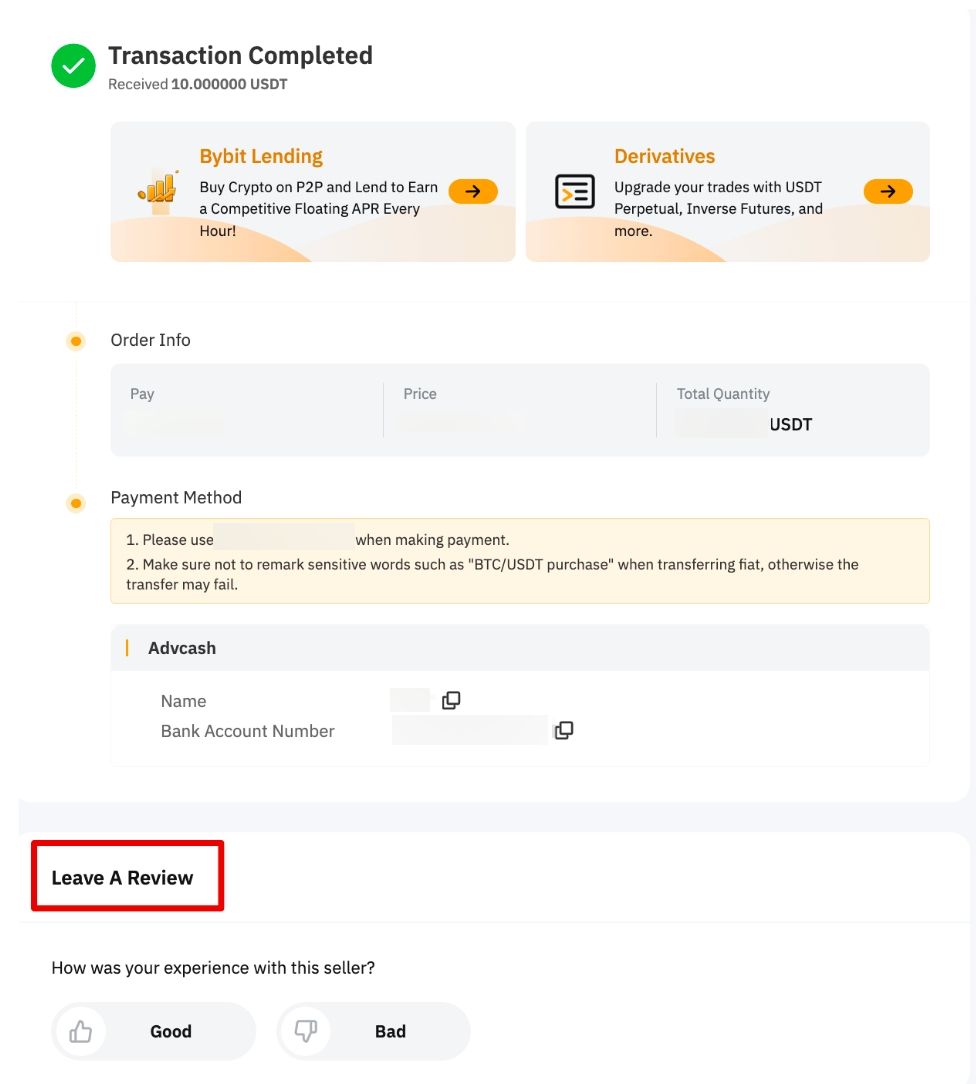 — P2P транзакциясын аяқтағаннан кейін саудалық контрагент туралы пікір қалдыру міндетті емес.