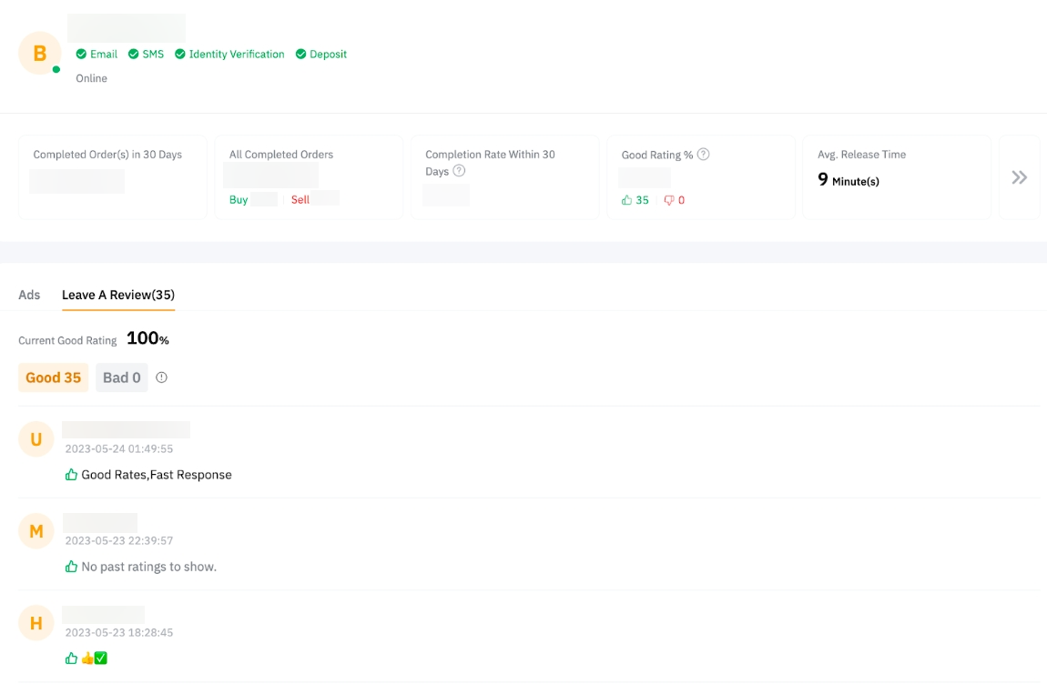 — Пайдаланушылар контрагент үшін тек а үшін пікір қалдыруға рұқсат етіледі Аяқталды P2P тапсырысы. Тек бір шолу олардың нақты сауда тәжірибесіне негізделген әрбір пайдаланушыға қалдыруға болады.