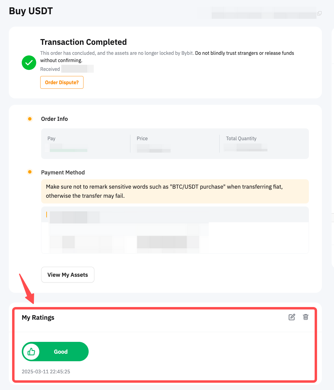 2-қадам: Сауда тәжірибеңізді бағалаудан басқа, Bybit Kazakhstan P2P шолу мүмкіндігі саудалық контрагентіңіздің пікірлерін қалдыруға мүмкіндік береді.