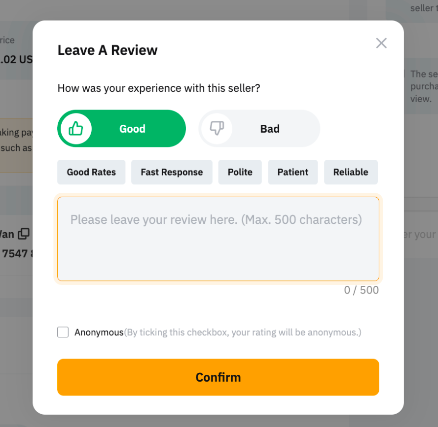Сіз және басқа пайдаланушылар контрагенттің P2P профиль бетінде қалдырған пікірлері көрінетінін ескеріңіз барлық P2P трейдерлері. Сондықтан сіздің пікірлеріңіз маңызды және P2P жарнамасын таңдау кезінде басқа пайдаланушылардың шешімдеріне әсер етуі мүмкін. Біз барлық пайдаланушыларды платформадағы барлық P2P трейдерлері үшін сауда тәжірибесін жақсартуға көмектесу үшін адал және сындарлы пікір қалдыруға шақырамыз.