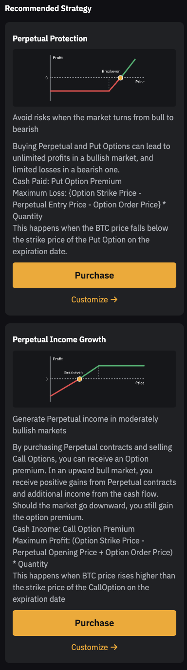 USDT мерзімсіз саудашарттары, USDC мерзімсіз саудашарттары, USDC фьючерстік және USDC опциондар саудашарттары арқылы сіз 200-ге дейін позицияны теңшей аласыз. Оған қоса, әртүрлі нарықтық жағдайларда әртүрлі инвестициялық идеялар үшін стрэдл стратегияларының, баттерфляй стратегияларының, темір кондор стратегияларының, стрэнгл стратегияларының, колл/пут спрэді стратегияларының, сақтандырылған колл стратегияларының және қорғағыш пут стратегияларының мүмкіндіктерін ашыңыз.
