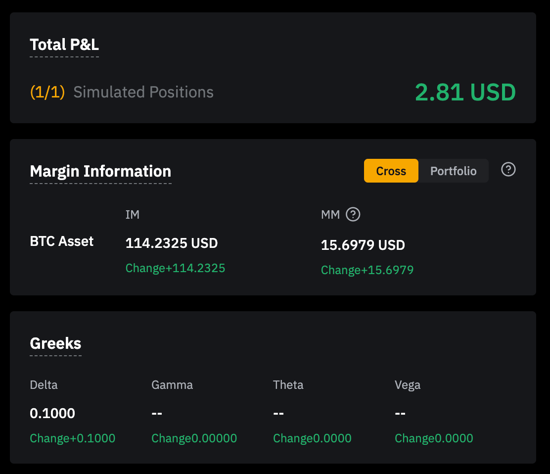 Беттің оң жағында сіз әртүрлі маңызды ақпаратты, мысалы, жалпы табыс пен шығындарды, симуляциялық позицияны, қолданылған маржаны және грек мәнін көре аласыз.