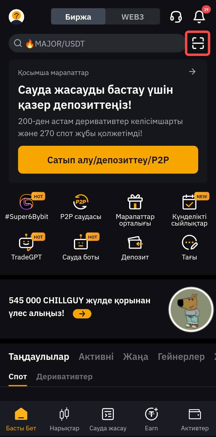 2-қадам: Bybit қосымшасын ашыңыз және жоғарғы оң жақ бұрыштағы QR код сканері белгішесін басыңыз. Bybit қосымшасына кіргеніңізді тексеріңіз.