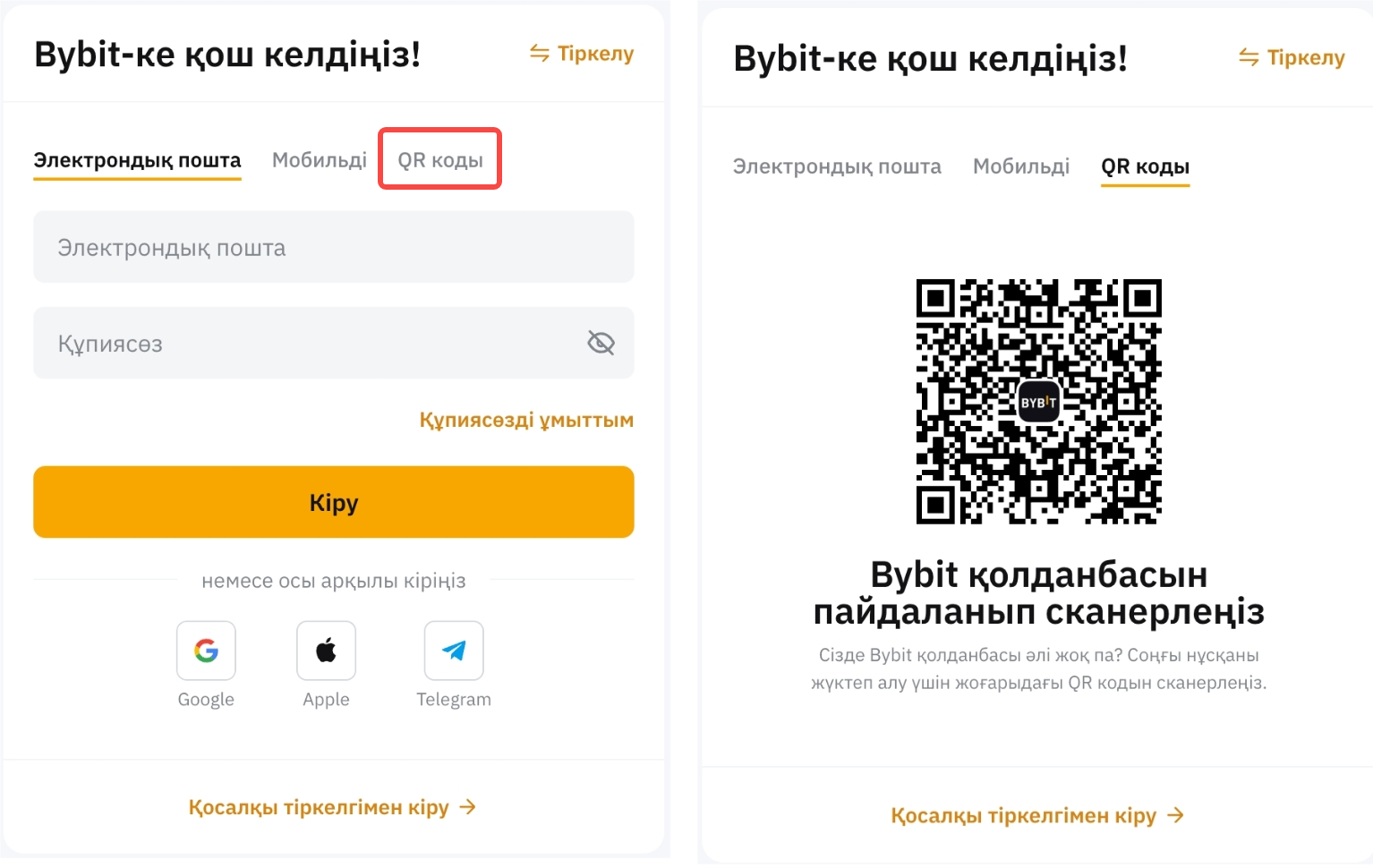 1-қадам: Bybit веб-сайтындағы кіру бетіне өтіңіз және жоғарғы оң жақ бұрыштағы интерактивті сары QR кодын басыңыз.