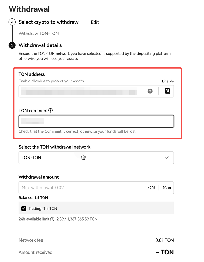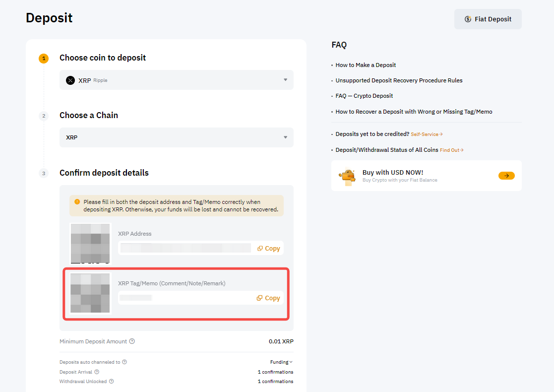 — Депозиттік тег/мемо талап ететін монета депозиттері үшін, XRP, EOS, TON тізбегі және т.б, ақшаны алу туралы сұрау бетіндегі Түсініктеме/Ескертпе/Ескертпе жолында депозит туралы жазбаны/тегті дұрыс толтыруды ұмытпаңыз. Төменде көрсетілгендей депозит терезесінен жазбаңызды/тегіңізді таба аласыз. Жазбасыз/белгісіз немесе қате меморандум/тегпен депозит салу активтерді жоғалтуға әкелуі мүмкін. Қосымша ақпаратты мына жерден қараңыз Жиі қойылатын сұрақтар — желідегі криптографиялық депозиттер.