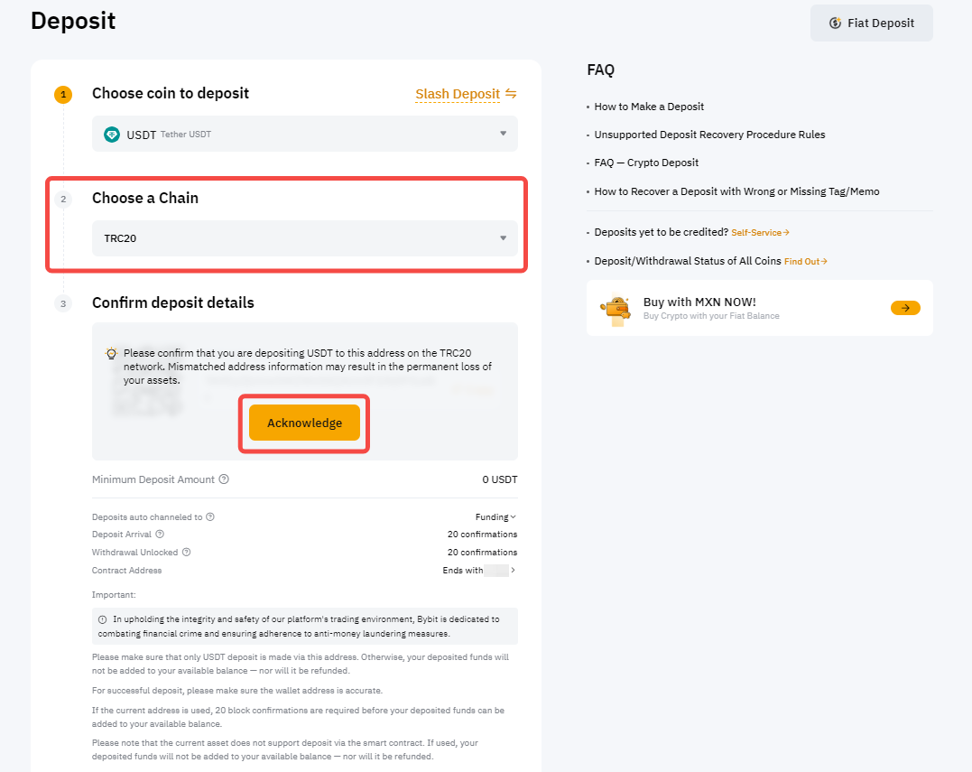 3-қадам: Пайдаланатын тізбек түрін таңдаңыз. Ақпараттық хабарламаны растағаннан кейін сіз Bybit Kazakhstan депозитінің мекенжайын көресіз. Сіз QR кодын сканерлей аласыз немесе депозит мекенжайын көшіріп, оны ақшаны жіберуге болатын тағайындалған мекенжай ретінде пайдалана аласыз.