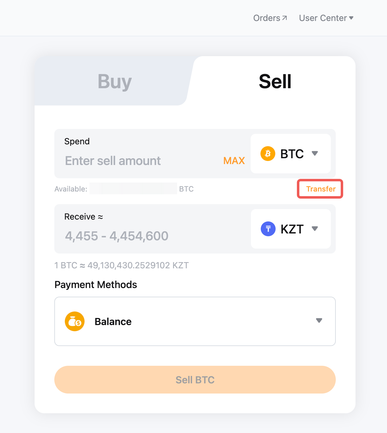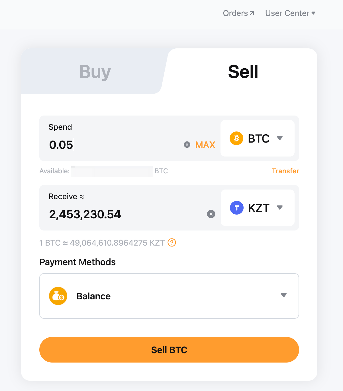 - Монетаны таңдаңыз (BTC, ETH, USDT немесе USDC) сату