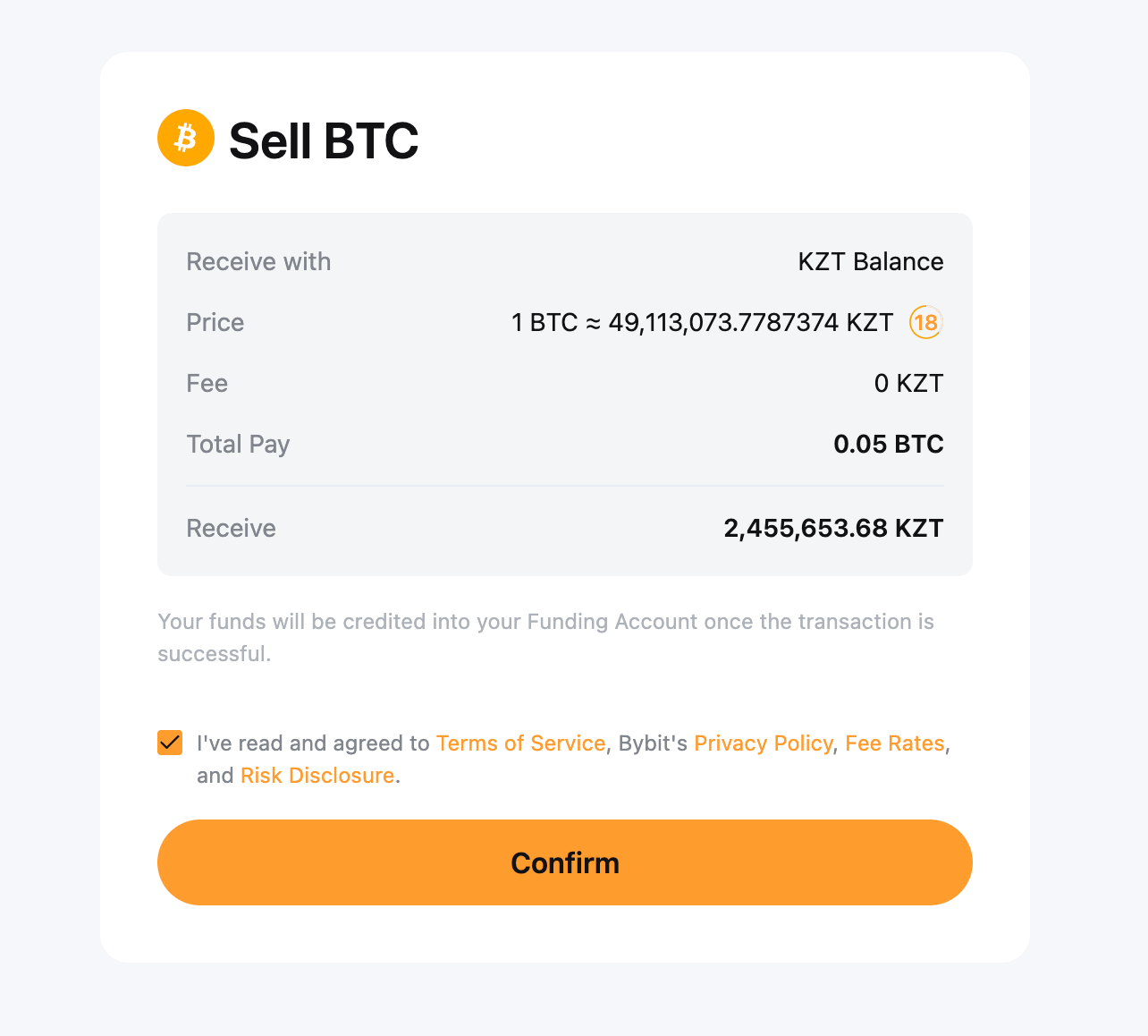 4-қадам:. Bybit монетаны көрсетілген айырбастау бағамы бойынша теңгеге айырбастайды және оны сіздің қаржыландыру шотыңызға аударады. Шарттар мен ережелерді тексеріп, түймесін басыңыз Растау жалғастыру.
