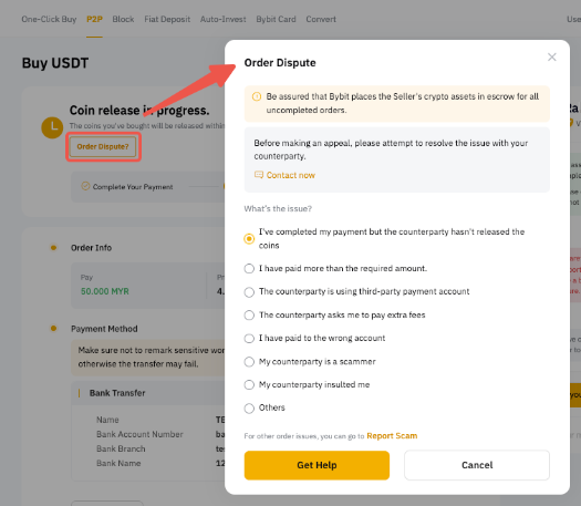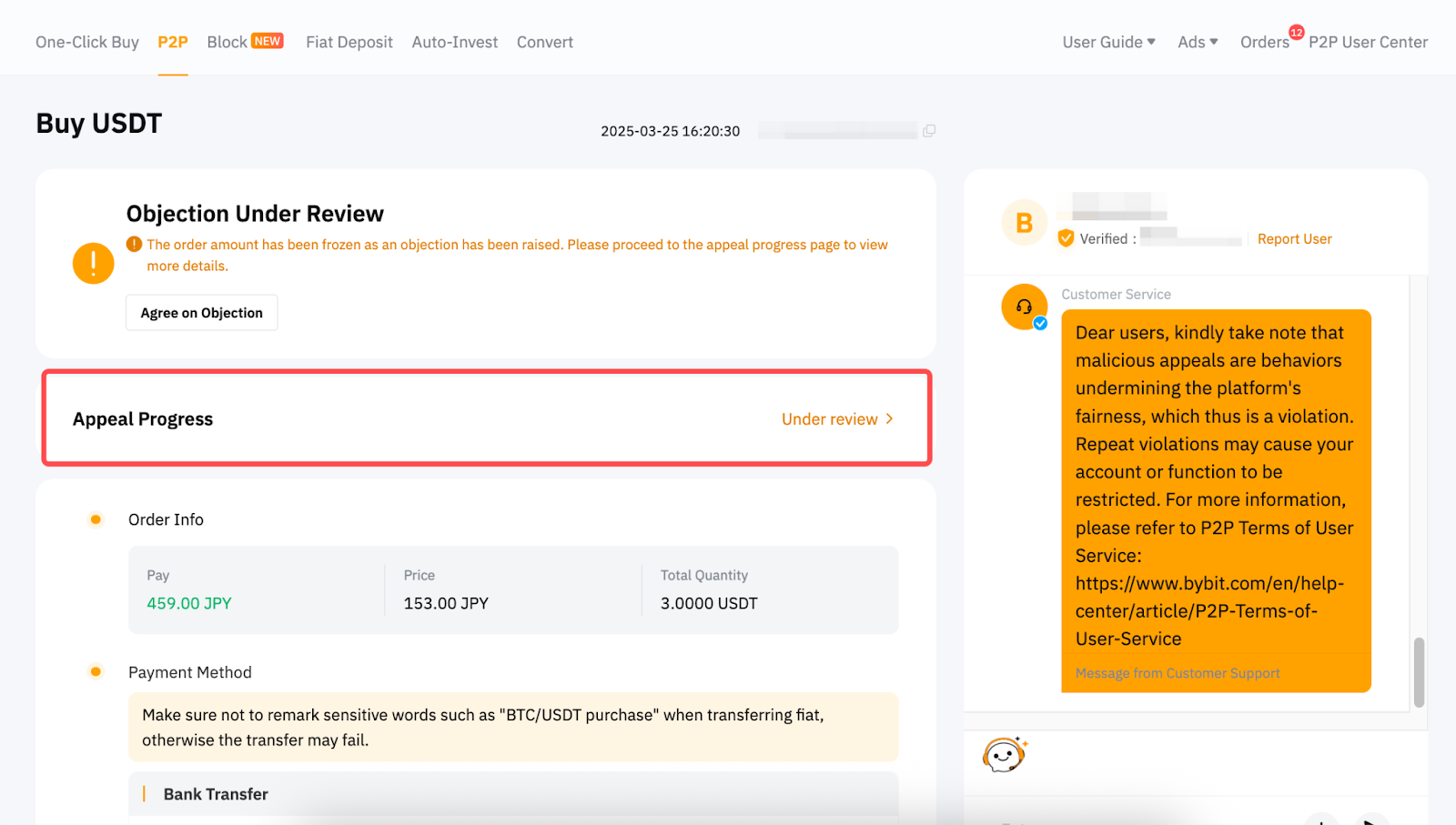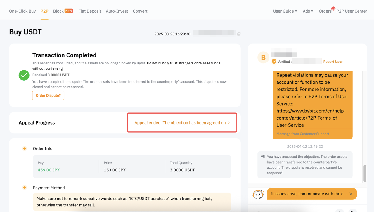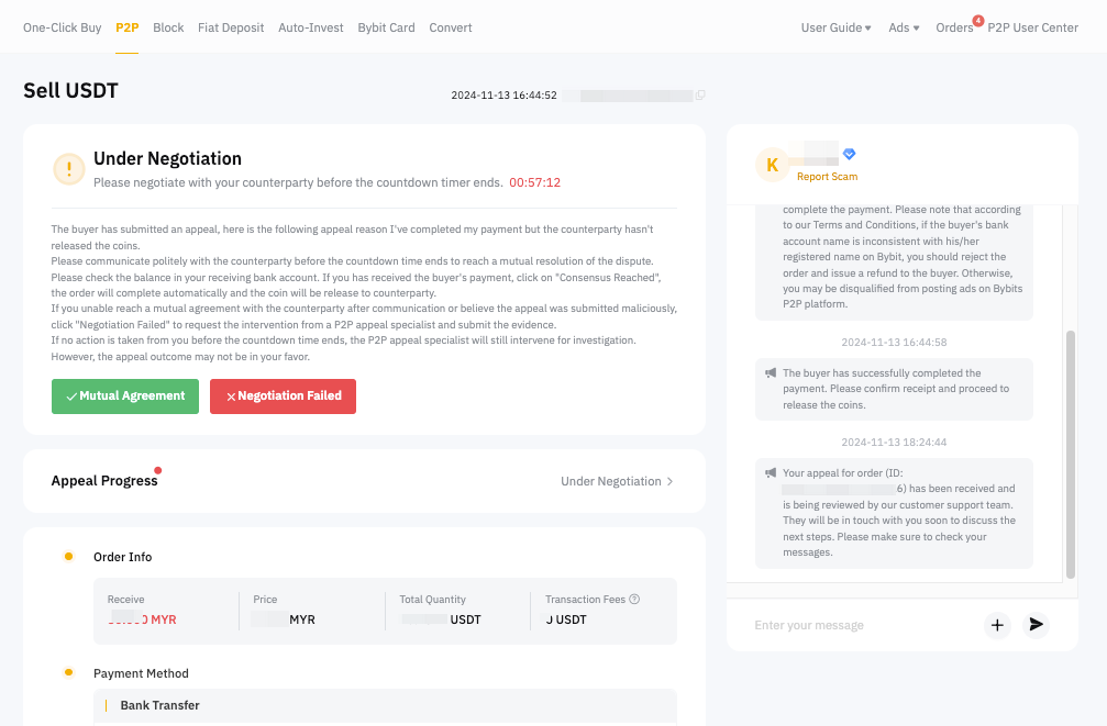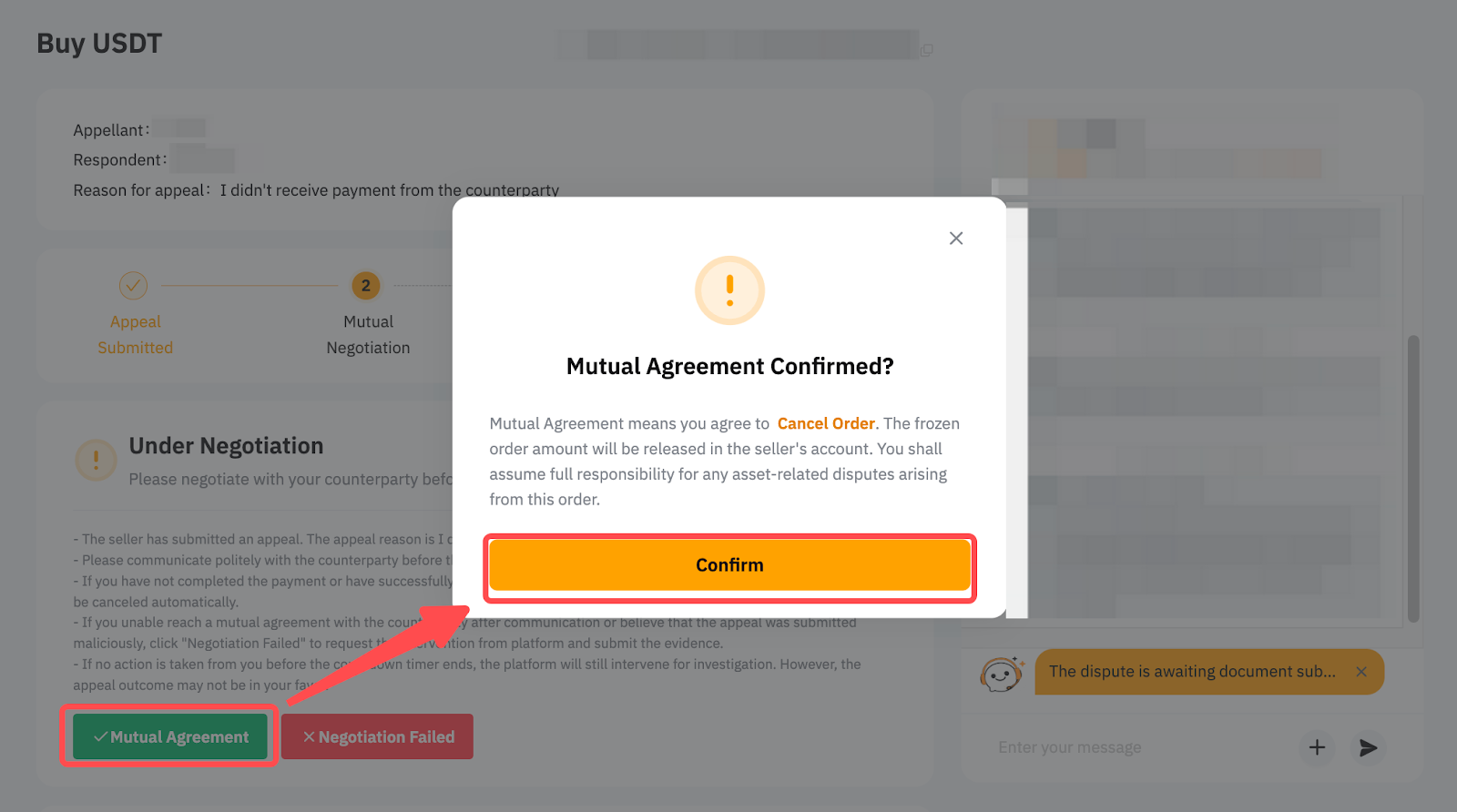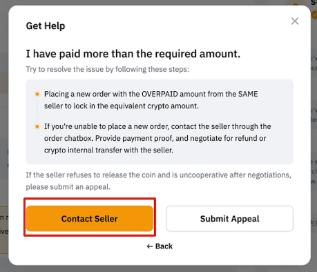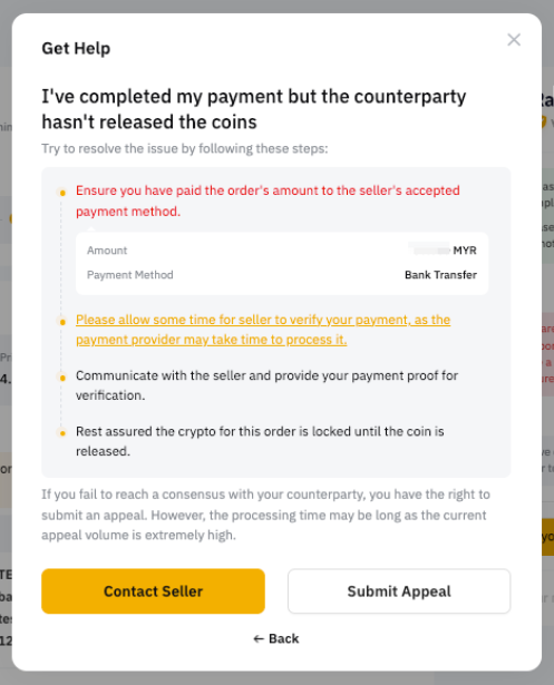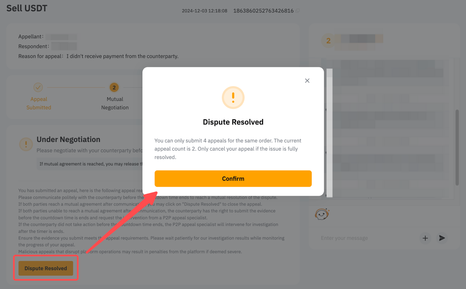 P2P транзакциялары кезінде кейбір пайдаланушылар тапсырыстарды орналастыруды елемеуі немесе алаяқтықты танымауы мүмкін, бұл тапсырыс сәйкессіздіктеріне әкеледі. Апелляцияны бастамас бұрын пайдаланушыларға мынаны пайдалану ұсынылады Чат қорабына тапсырыс беріңіз олардың контрагентімен қарым-қатынас жасау. Мәселе шешілмесе, төмендегі нұсқаулықты орындау арқылы P2P маманы және тәуекел тобынан көмек алуға өтініш жіберіңіз.