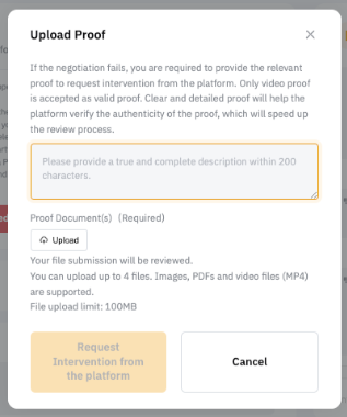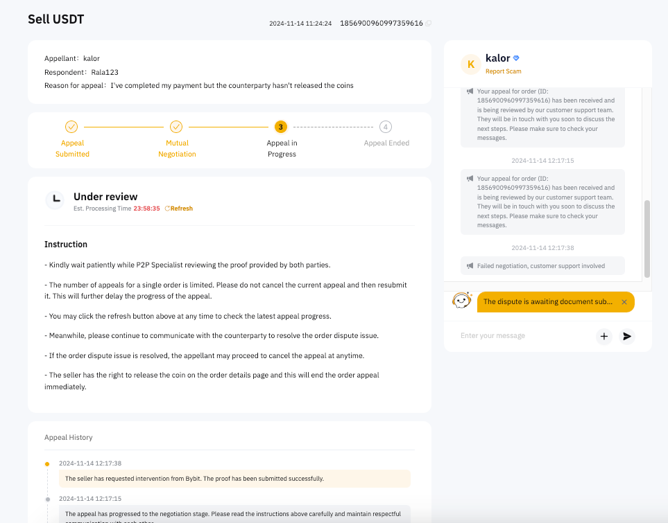 Шағымданушылар үшін, егер дау келіссөздерден кейін шешілмесе немесе жауап берушіден жауап алмасаңыз, P2P маманы чатқа қосылып, кері санақ таймері аяқталғаннан кейін қосымша көмек көрсетеді. Процестің біркелкі өтуін қамтамасыз ету үшін біздің талаптарға сәйкес дәлелдеріңізді жіберіңіз.