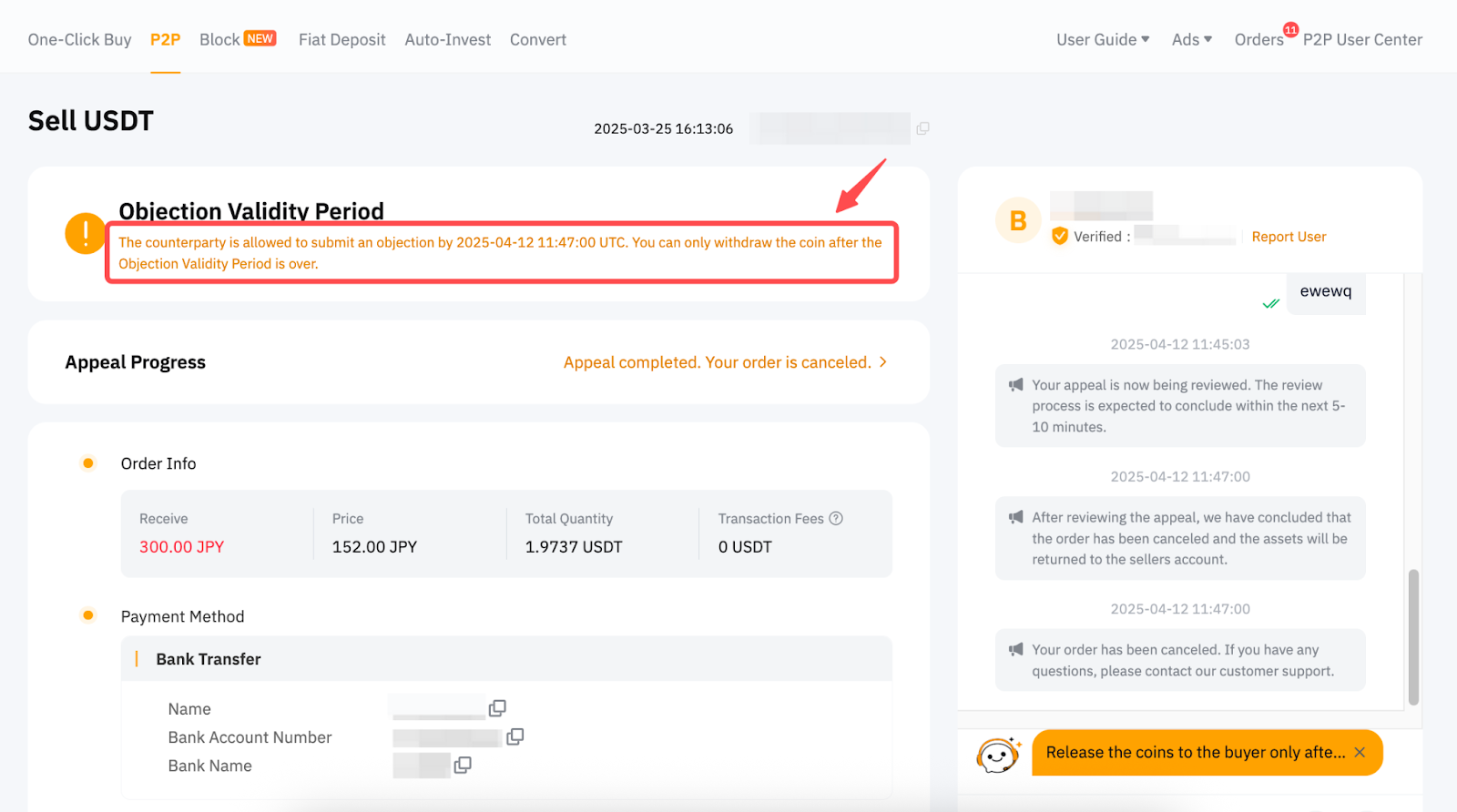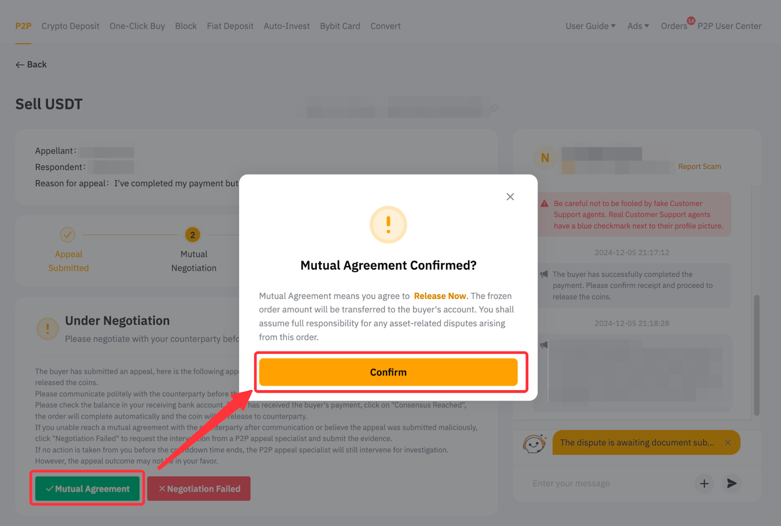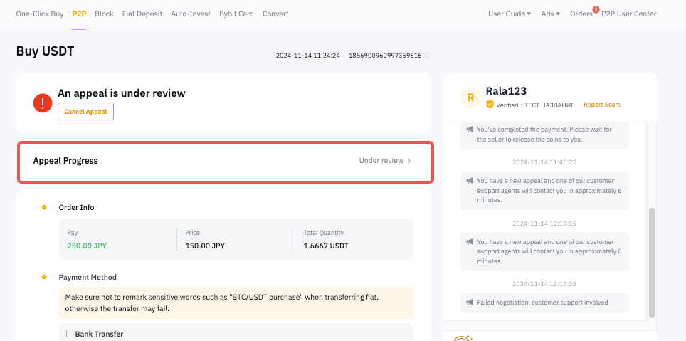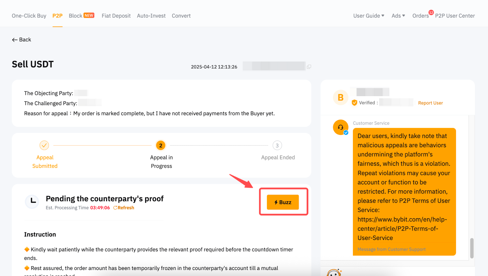 Арнайы P2P тәуекелі және апелляциялық маманы апелляцияңызды сәтті жібергеннен кейін сізге бірінші келген, бірінші шығыс (FIFO) негізінде әрі қарай көмектесу үшін болжалды уақыт ішінде P2P тапсырысы бойынша сөйлесу жолағына қосылады. Апелляцияңыздың автоматты түрде жойылуына жол бермеу және оның біркелкі өңделуін қамтамасыз ету үшін олардың нұсқауларын орындаңыз.